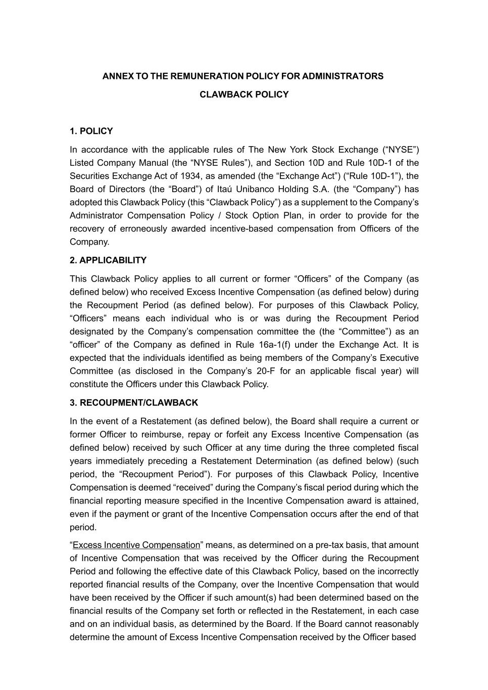 ANNEX TO THE REMUNERATION POLICY FOR ADMINISTRATORS CLAWBACK POLICY 1. POLICY In accordance with the applicable rules of The New York Stock Exchange (“NYSE”) Listed Company Manual (the “NYSE Rules”), and Section 10D and Rule 10D-1 of the Securities Exchange Act of 1934, as amended (the “Exchange Act”) (“Rule 10D-1”), the Board of Directors (the “Board”) of Itaú Unibanco Holding S.A. (the “Company”) has adopted this Clawback Policy (this “Clawback Policy”) as a supplement to the Company’s Administrator Compensation Policy / Stock Option Plan, in order to provide for the recovery of erroneously awarded incentive-based compensation from Officers of the Company. 2. APPLICABILITY This Clawback Policy applies to all current or former “Officers” of the Company (as defined below) who received Excess Incentive Compensation (as defined below) during the Recoupment Period (as defined below). For purposes of this Clawback Policy, “Officers” means each individual who is or was during the Recoupment Period designated by the Company’s compensation committee the (the “Committee”) as an “officer” of the Company as defined in Rule 16a-1(f) under the Exchange Act. It is expected that the individuals identified as being members of the Company’s Executive Committee (as disclosed in the Company’s 20-F for an applicable fiscal year) will constitute the Officers under this Clawback Policy. 3. RECOUPMENT/CLAWBACK In the event of a Restatement (as defined below), the Board shall require a current or former Officer to reimburse, repay or forfeit any Excess Incentive Compensation (as defined below) received by such Officer at any time during the three completed fiscal years immediately preceding a Restatement Determination (as defined below) (such period, the “Recoupment Period”). For purposes of this Clawback Policy, Incentive Compensation is deemed “received” during the Company’s fiscal period during which the financial reporting measure specified in the Incentive Compensation award is attained, even if the payment or grant of the Incentive Compensation occurs after the end of that period. “Excess Incentive Compensation” means, as determined on a pre-tax basis, that amount of Incentive Compensation that was received by the Officer during the Recoupment Period and following the effective date of this Clawback Policy, based on the incorrectly reported financial results of the Company, over the Incentive Compensation that would have been received by the Officer if such amount(s) had been determined based on the financial results of the Company set forth or reflected in the Restatement, in each case and on an individual basis, as determined by the Board. If the Board cannot reasonably determine the amount of Excess Incentive Compensation received by the Officer based