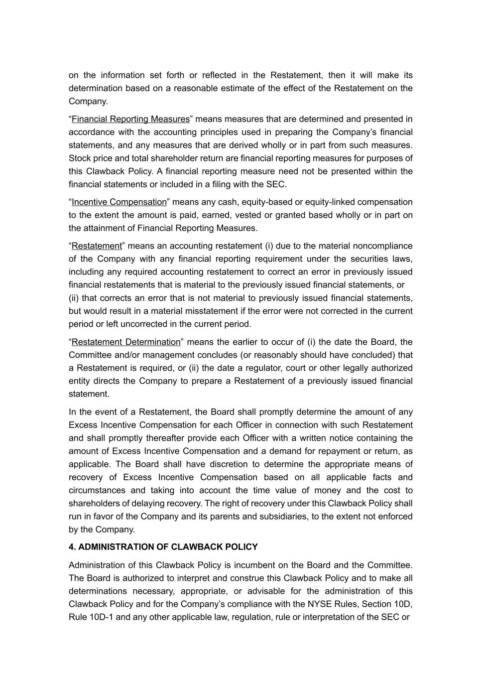 on the information set forth or reflected in the Restatement, then it will make its determination based on a reasonable estimate of the effect of the Restatement on the Company. “Financial Reporting Measures” means measures that are determined and presented in accordance with the accounting principles used in preparing the Company’s financial statements, and any measures that are derived wholly or in part from such measures. Stock price and total shareholder return are financial reporting measures for purposes of this Clawback Policy. A financial reporting measure need not be presented within the financial statements or included in a filing with the SEC. “Incentive Compensation” means any cash, equity-based or equity-linked compensation to the extent the amount is paid, earned, vested or granted based wholly or in part on the attainment of Financial Reporting Measures. “Restatement” means an accounting restatement (i) due to the material noncompliance of the Company with any financial reporting requirement under the securities laws, including any required accounting restatement to correct an error in previously issued financial restatements that is material to the previously issued financial statements, or (ii) that corrects an error that is not material to previously issued financial statements, but would result in a material misstatement if the error were not corrected in the current period or left uncorrected in the current period. “Restatement Determination” means the earlier to occur of (i) the date the Board, the Committee and/or management concludes (or reasonably should have concluded) that a Restatement is required, or (ii) the date a regulator, court or other legally authorized entity directs the Company to prepare a Restatement of a previously issued financial statement. In the event of a Restatement, the Board shall promptly determine the amount of any Excess Incentive Compensation for each Officer in connection with such Restatement and shall promptly thereafter provide each Officer with a written notice containing the amount of Excess Incentive Compensation and a demand for repayment or return, as applicable. The Board shall have discretion to determine the appropriate means of recovery of Excess Incentive Compensation based on all applicable facts and circumstances and taking into account the time value of money and the cost to shareholders of delaying recovery. The right of recovery under this Clawback Policy shall run in favor of the Company and its parents and subsidiaries, to the extent not enforced by the Company. 4. ADMINISTRATION OF CLAWBACK POLICY Administration of this Clawback Policy is incumbent on the Board and the Committee. The Board is authorized to interpret and construe this Clawback Policy and to make all determinations necessary, appropriate, or advisable for the administration of this Clawback Policy and for the Company’s compliance with the NYSE Rules, Section 10D, Rule 10D-1 and any other applicable law, regulation, rule or interpretation of the SEC or