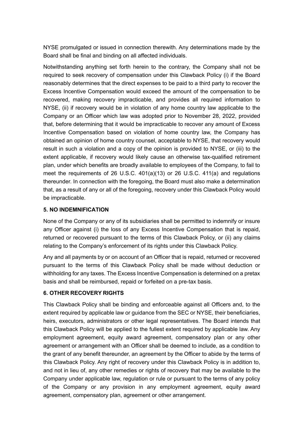 NYSE promulgated or issued in connection therewith. Any determinations made by the Board shall be final and binding on all affected individuals. Notwithstanding anything set forth herein to the contrary, the Company shall not be required to seek recovery of compensation under this Clawback Policy (i) if the Board reasonably determines that the direct expenses to be paid to a third party to recover the Excess Incentive Compensation would exceed the amount of the compensation to be recovered, making recovery impracticable, and provides all required information to NYSE, (ii) if recovery would be in violation of any home country law applicable to the Company or an Officer which law was adopted prior to November 28, 2022, provided that, before determining that it would be impracticable to recover any amount of Excess Incentive Compensation based on violation of home country law, the Company has obtained an opinion of home country counsel, acceptable to NYSE, that recovery would result in such a violation and a copy of the opinion is provided to NYSE, or (iii) to the extent applicable, if recovery would likely cause an otherwise tax-qualified retirement plan, under which benefits are broadly available to employees of the Company, to fail to meet the requirements of 26 U.S.C. 401(a)(13) or 26 U.S.C. 411(a) and regulations thereunder. In connection with the foregoing, the Board must also make a determination that, as a result of any or all of the foregoing, recovery under this Clawback Policy would be impracticable. 5. NO INDEMNIFICATION None of the Company or any of its subsidiaries shall be permitted to indemnify or insure any Officer against (i) the loss of any Excess Incentive Compensation that is repaid, returned or recovered pursuant to the terms of this Clawback Policy, or (ii) any claims relating to the Company’s enforcement of its rights under this Clawback Policy. Any and all payments by or on account of an Officer that is repaid, returned or recovered pursuant to the terms of this Clawback Policy shall be made without deduction or withholding for any taxes. The Excess Incentive Compensation is determined on a pretax basis and shall be reimbursed, repaid or forfeited on a pre-tax basis. 6. OTHER RECOVERY RIGHTS This Clawback Policy shall be binding and enforceable against all Officers and, to the extent required by applicable law or guidance from the SEC or NYSE, their beneficiaries, heirs, executors, administrators or other legal representatives. The Board intends that this Clawback Policy will be applied to the fullest extent required by applicable law. Any employment agreement, equity award agreement, compensatory plan or any other agreement or arrangement with an Officer shall be deemed to include, as a condition to the grant of any benefit thereunder, an agreement by the Officer to abide by the terms of this Clawback Policy. Any right of recovery under this Clawback Policy is in addition to, and not in lieu of, any other remedies or rights of recovery that may be available to the Company under applicable law, regulation or rule or pursuant to the terms of any policy of the Company or any provision in any employment agreement, equity award agreement, compensatory plan, agreement or other arrangement.