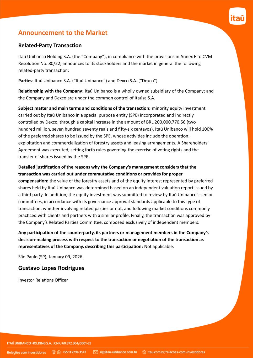 Announcement to the Market Related-Party Transaction Itaú Unibanco Holding S.A. (the “Company”), in compliance with the provisions in Annex F to CVM Resolution No. 80/22, announces to its stockholders and the market in general the following related-party transaction: Parties: Itaú Unibanco S.A. (“Itaú Unibanco”) and Dexco S.A. (“Dexco”). Relationship with the Company: Itaú Unibanco is a wholly owned subsidiary of the Company; and the Company and Dexco are under the common control of Itaúsa S.A. Subject matter and main terms and conditions of the transaction: minority equity investment carried out by Itaú Unibanco in a special purpose entity (SPE) incorporated and indirectly controlled by Dexco, through a capital increase in the amount of BRL 200,000,770.56 (two hundred million, seven hundred seventy reais and fifty-six centavos). Itaú Unibanco will hold 100% of the preferred shares to be issued by the SPE, whose activities include the operation, exploitation and commercialization of forestry assets and leasing arrangements. A Shareholders’ Agreement was executed, setting forth rules governing the exercise of voting rights and the transfer of shares issued by the SPE. Detailed justification of the reasons why the Company’s management considers that the transaction was carried out under commutative conditions or provides for proper compensation: the value of the forestry assets and of the equity interest represented by preferred shares held by Itaú Unibanco was determined based on an independent valuation report issued by a third party. In addition, the equity investment was submitted to review by Itaú Unibanco’s senior committees, in accordance with its governance approval standards applicable to this type of transaction, whether involving related parties or not, and following market conditions commonly practiced with clients and partners with a similar profile. Finally, the transaction was approved by the Company’s Related Parties Committee, composed exclusively of independent members. Any participation of the counterparty, its partners or management members in the Company’s decision-making process with respect to the transaction or negotiation of the transaction as representatives of the Company, describing this participation: Not applicable. São Paulo (SP), January 09, 2026. Gustavo Lopes Rodrigues Investor Relations Officer
