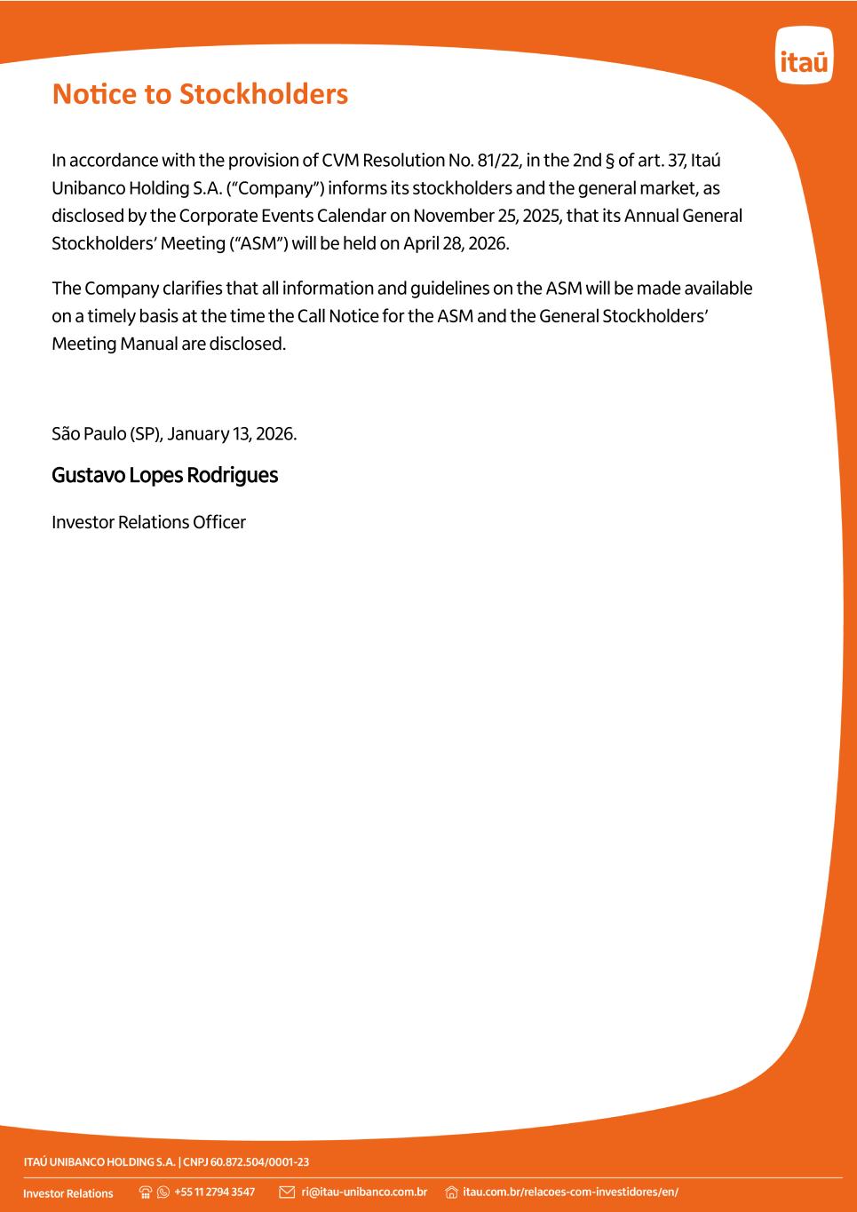 Notice to Stockholders In accordance with the provision of CVM Resolution No. 81/22, in the 2nd § of art. 37, Itaú Unibanco Holding S.A. (“Company”) informs its stockholders and the general market, as disclosed by the Corporate Events Calendar on November 25, 2025, that its Annual General Stockholders’ Meeting (“ASM”) will be held on April 28, 2026. The Company clarifies that all information and guidelines on the ASM will be made available on a timely basis at the time the Call Notice for the ASM and the General Stockholders’ Meeting Manual are disclosed. São Paulo (SP), January 13, 2026. Gustavo Lopes Rodrigues Investor Relations Officer