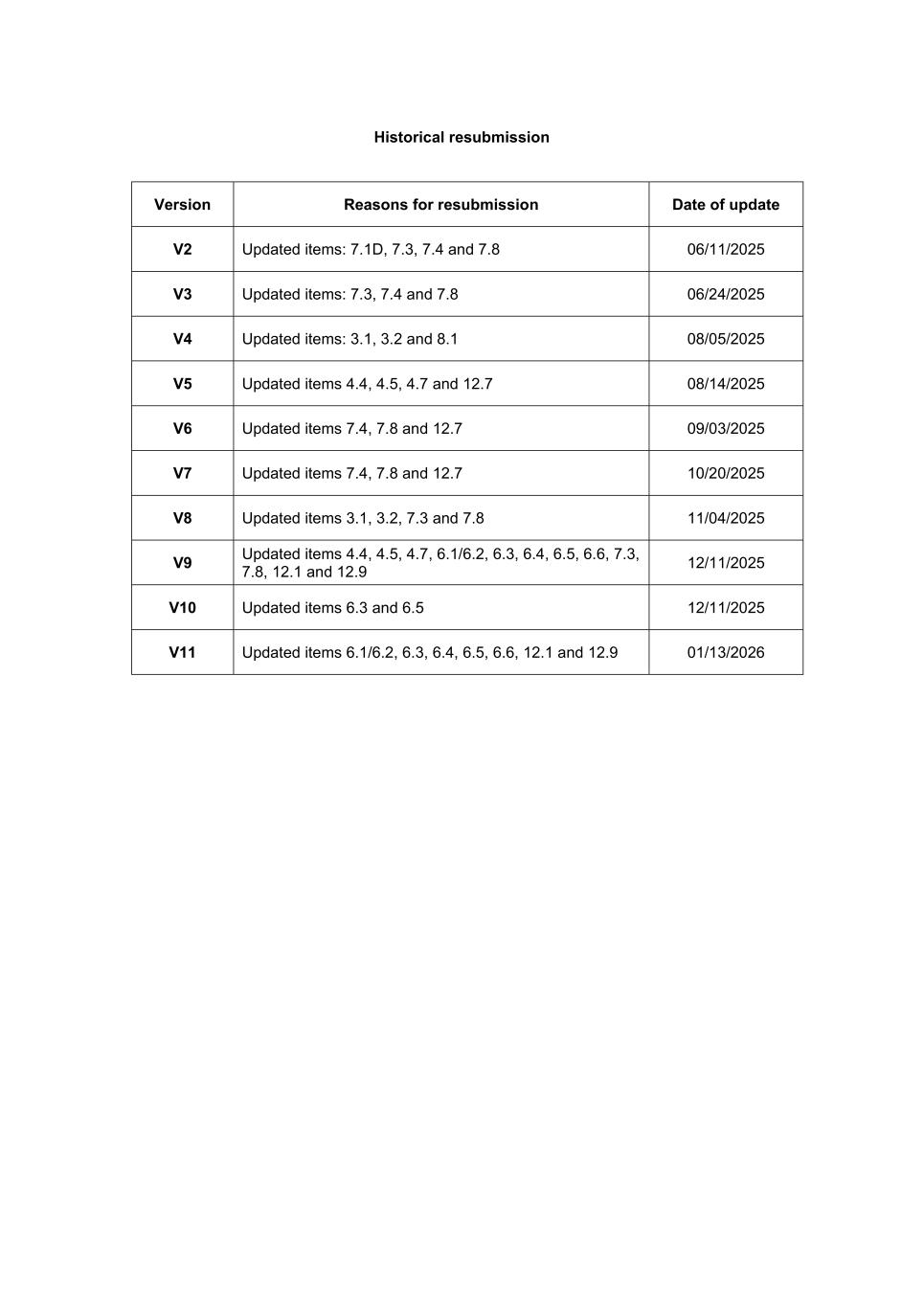 Historical resubmission Version Reasons for resubmission Date of update V2 Updated items: 7.1D, 7.3, 7.4 and 7.8 06/11/2025 V3 Updated items: 7.3, 7.4 and 7.8 06/24/2025 V4 Updated items: 3.1, 3.2 and 8.1 08/05/2025 V5 Updated items 4.4, 4.5, 4.7 and 12.7 08/14/2025 V6 Updated items 7.4, 7.8 and 12.7 09/03/2025 V7 Updated items 7.4, 7.8 and 12.7 10/20/2025 V8 Updated items 3.1, 3.2, 7.3 and 7.8 11/04/2025 V9 Updated items 4.4, 4.5, 4.7, 6.1/6.2, 6.3, 6.4, 6.5, 6.6, 7.3, 7.8, 12.1 and 12.9 12/11/2025 V10 Updated items 6.3 and 6.5 12/11/2025 V11 Updated items 6.1/6.2, 6.3, 6.4, 6.5, 6.6, 12.1 and 12.9 01/13/2026