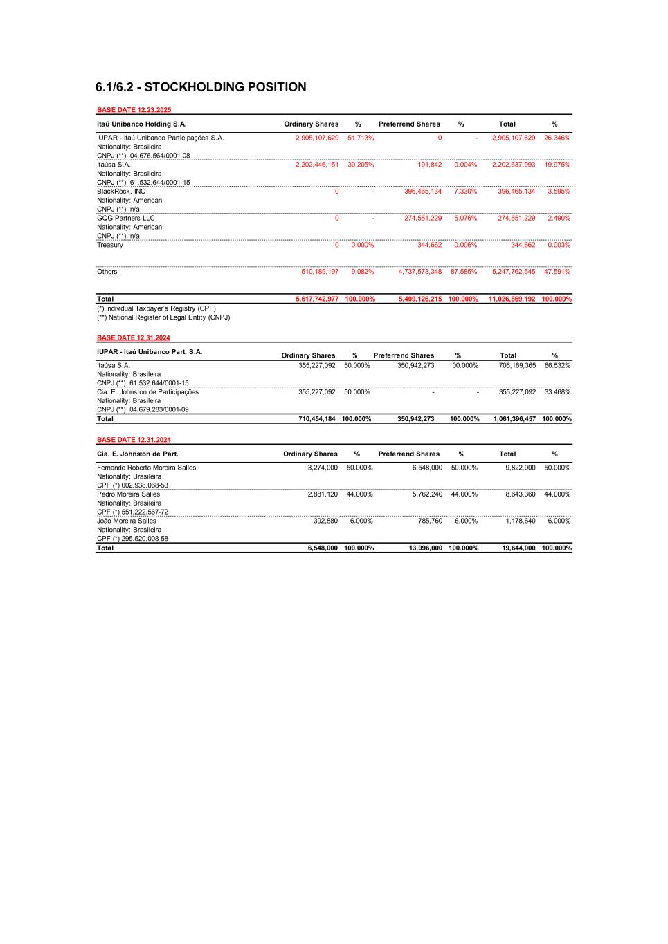 6.1/6.2 - STOCKHOLDING POSITION BASE DATE 12.23.2025 Itaú Unibanco Holding S.A. Ordinary Shares % Preferrend Shares % Total % IUPAR - Itaú Unibanco Participações S.A. 2,905,107,629 51.713% 0 - 2,905,107,629 26.346% Nationality: Brasileira CNPJ (**) 04.676.564/0001-08 Itaúsa S.A. 2,202,446,151 39.205% 191,842 0.004% 2,202,637,993 19.975% Nationality: Brasileira CNPJ (**) 61.532.644/0001-15 BlackRock, INC 0 - 396,465,134 7.330% 396,465,134 3.595% Nationality: American CNPJ (**) n/a GQG Partners LLC 0 - 274,551,229 5.076% 274,551,229 2.490% Nationality: American CNPJ (**) n/a Treasury 0 0.000% 344,662 0.006% 344,662 0.003% Others 510,189,197 9.082% 4,737,573,348 87.585% 5,247,762,545 47.591% Total 5,617,742,977 100.000% 5,409,126,215 100.000% 11,026,869,192 100.000% (*) Individual Taxpayer’s Registry (CPF) (**) National Register of Legal Entity (CNPJ) BASE DATE 12.31.2024 IUPAR - Itaú Unibanco Part. S.A. Ordinary Shares % Preferrend Shares % Total % Itaúsa S.A. 355,227,092 50.000% 350,942,273 100.000% 706,169,365 66.532% Nationality: Brasileira CNPJ (**) 61.532.644/0001-15 Cia. E. Johnston de Participações 355,227,092 50.000% - - 355,227,092 33.468% Nationality: Brasileira CNPJ (**) 04.679.283/0001-09 Total 710,454,184 100.000% 350,942,273 100.000% 1,061,396,457 100.000% BASE DATE 12.31.2024 Cia. E. Johnston de Part. Ordinary Shares % Preferrend Shares % Total % Fernando Roberto Moreira Salles 3,274,000 50.000% 6,548,000 50.000% 9,822,000 50.000% Nationality: Brasileira CPF (*) 002.938.068-53 Pedro Moreira Salles 2,881,120 44.000% 5,762,240 44.000% 8,643,360 44.000% Nationality: Brasileira CPF (*) 551.222.567-72 João Moreira Salles 392,880 6.000% 785,760 6.000% 1,178,640 6.000% Nationality: Brasileira CPF (*) 295.520.008-58 Total 6,548,000 100.000% 13,096,000 100.000% 19,644,000 100.000%
