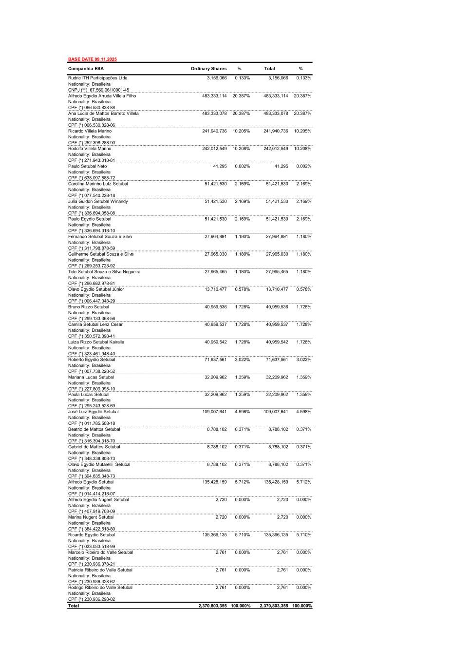 BASE DATE 09.11.2025 Companhia ESA Ordinary Shares % Total % Rudric ITH Participações Ltda. 3,156,066 0.133% 3,156,066 0.133% Nationality: Brasileira CNPJ (**) 67.569.061/0001-45 Alfredo Egydio Arruda Villela Filho 483,333,114 20.387% 483,333,114 20.387% Nationality: Brasileira CPF (*) 066.530.838-88 Ana Lúcia de Mattos Barreto Villela 483,333,078 20.387% 483,333,078 20.387% Nationality: Brasileira CPF (*) 066.530.828-06 Ricardo Villela Marino 241,940,736 10.205% 241,940,736 10.205% Nationality: Brasileira CPF (*) 252.398.288-90 Rodolfo Villela Marino 242,012,549 10.208% 242,012,549 10.208% Nationality: Brasileira CPF (*) 271.943.018-81 Paulo Setubal Neto 41,295 0.002% 41,295 0.002% Nationality: Brasileira CPF (*) 638.097.888-72 Carolina Marinho Lutz Setubal 51,421,530 2.169% 51,421,530 2.169% Nationality: Brasileira CPF (*) 077.540.228-18 Julia Guidon Setubal Winandy 51,421,530 2.169% 51,421,530 2.169% Nationality: Brasileira CPF (*) 336.694.358-08 Paulo Egydio Setubal 51,421,530 2.169% 51,421,530 2.169% Nationality: Brasileira CPF (*) 336.694.318-10 Fernando Setubal Souza e Silva 27,964,891 1.180% 27,964,891 1.180% Nationality: Brasileira CPF (*) 311.798.878-59 Guilherme Setubal Souza e Silva 27,965,030 1.180% 27,965,030 1.180% Nationality: Brasileira CPF (*) 269.253.728-92 Tide Setubal Souza e Silva Nogueira 27,965,465 1.180% 27,965,465 1.180% Nationality: Brasileira CPF (*) 296.682.978-81 Olavo Egydio Setubal Júnior 13,710,477 0.578% 13,710,477 0.578% Nationality: Brasileira CPF (*) 006.447.048-29 Bruno Rizzo Setubal 40,959,536 1.728% 40,959,536 1.728% Nationality: Brasileira CPF (*) 299.133.368-56 Camila Setubal Lenz Cesar 40,959,537 1.728% 40,959,537 1.728% Nationality: Brasileira CPF (*) 350.572.098-41 Luiza Rizzo Setubal Kairalla 40,959,542 1.728% 40,959,542 1.728% Nationality: Brasileira CPF (*) 323.461.948-40 Roberto Egydio Setubal 71,637,561 3.022% 71,637,561 3.022% Nationality: Brasileira CPF (*) 007.738.228-52 Mariana Lucas Setubal 32,209,962 1.359% 32,209,962 1.359% Nationality: Brasileira CPF (*) 227.809.998-10 Paula Lucas Setubal 32,209,962 1.359% 32,209,962 1.359% Nationality: Brasileira CPF (*) 295.243.528-69 José Luiz Egydio Setubal 109,007,641 4.598% 109,007,641 4.598% Nationality: Brasileira CPF (*) 011.785.508-18 Beatriz de Mattos Setubal 8,788,102 0.371% 8,788,102 0.371% Nationality: Brasileira CPF (*) 316.394.318-70 Gabriel de Mattos Setubal 8,788,102 0.371% 8,788,102 0.371% Nationality: Brasileira CPF (*) 348.338.808-73 Olavo Egydio Mutarelli Setubal 8,788,102 0.371% 8,788,102 0.371% Nationality: Brasileira CPF (*) 394.635.348-73 Alfredo Egydio Setubal 135,428,159 5.712% 135,428,159 5.712% Nationality: Brasileira CPF (*) 014.414.218-07 Alfredo Egydio Nugent Setubal 2,720 0.000% 2,720 0.000% Nationality: Brasileira CPF (*) 407.919.708-09 Marina Nugent Setubal 2,720 0.000% 2,720 0.000% Nationality: Brasileira CPF (*) 384.422.518-80 Ricardo Egydio Setubal 135,366,135 5.710% 135,366,135 5.710% Nationality: Brasileira CPF (*) 033.033.518-99 Marcelo Ribeiro do Valle Setubal 2,761 0.000% 2,761 0.000% Nationality: Brasileira CPF (*) 230.936.378-21 Patricia Ribeiro do Valle Setubal 2,761 0.000% 2,761 0.000% Nationality: Brasileira CPF (*) 230.936.328-62 Rodrigo Ribeiro do Valle Setubal 2,761 0.000% 2,761 0.000% Nationality: Brasileira CPF (*) 230.936.298-02 Total 2,370,803,355 100.000% 2,370,803,355 100.000%