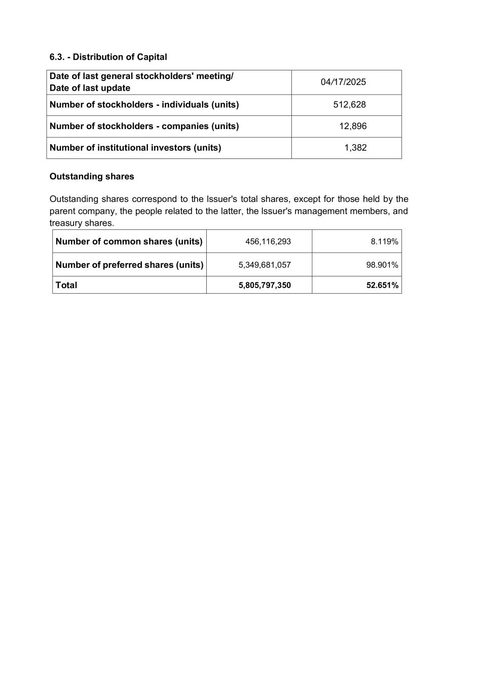 6.3. - Distribution of Capital Date of last general stockholders' meeting/ Date of last update 04/17/2025 Number of stockholders - individuals (units) 512,628 Number of stockholders - companies (units) 12,896 Number of institutional investors (units) 1,382 Outstanding shares Outstanding shares correspond to the lssuer's total shares, except for those held by the parent company, the people related to the latter, the lssuer's management members, and treasury shares. Number of common shares (units) 456,116,293 8.119% Number of preferred shares (units) 5,349,681,057 98.901% Total 5,805,797,350 52.651%