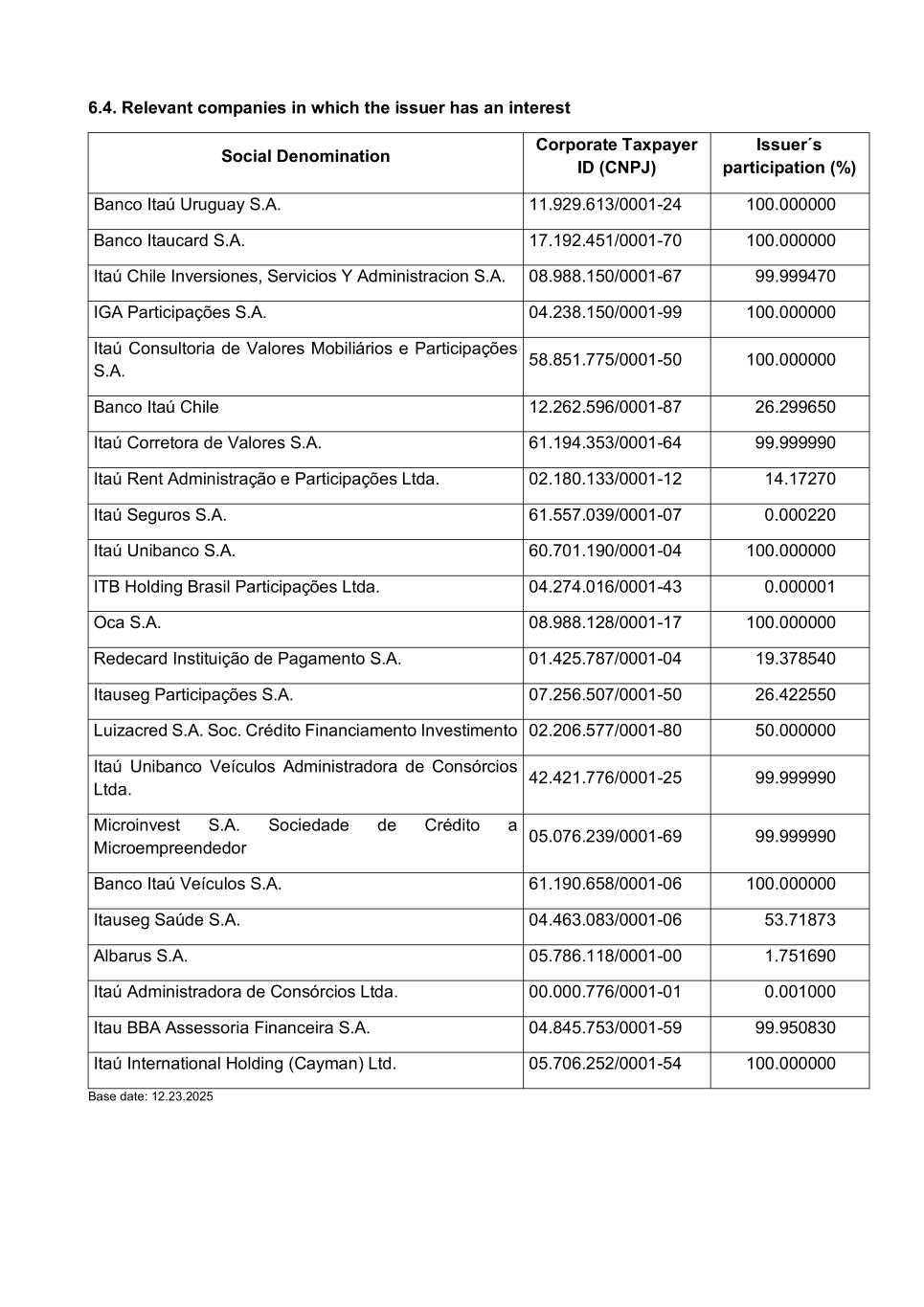 6.4. Relevant companies in which the issuer has an interest Social Denomination Corporate Taxpayer ID (CNPJ) Issuer´s participation (%) Banco Itaú Uruguay S.A. 11.929.613/0001-24 100.000000 Banco Itaucard S.A. 17.192.451/0001-70 100.000000 Itaú Chile Inversiones, Servicios Y Administracion S.A. 08.988.150/0001-67 99.999470 IGA Participações S.A. 04.238.150/0001-99 100.000000 Itaú Consultoria de Valores Mobiliários e Participações S.A. 58.851.775/0001-50 100.000000 Banco Itaú Chile 12.262.596/0001-87 26.299650 Itaú Corretora de Valores S.A. 61.194.353/0001-64 99.999990 Itaú Rent Administração e Participações Ltda. 02.180.133/0001-12 14.17270 Itaú Seguros S.A. 61.557.039/0001-07 0.000220 Itaú Unibanco S.A. 60.701.190/0001-04 100.000000 ITB Holding Brasil Participações Ltda. 04.274.016/0001-43 0.000001 Oca S.A. 08.988.128/0001-17 100.000000 Redecard Instituição de Pagamento S.A. 01.425.787/0001-04 19.378540 Itauseg Participações S.A. 07.256.507/0001-50 26.422550 Luizacred S.A. Soc. Crédito Financiamento Investimento 02.206.577/0001-80 50.000000 Itaú Unibanco Veículos Administradora de Consórcios Ltda. 42.421.776/0001-25 99.999990 Microinvest S.A. Sociedade de Crédito a Microempreendedor 05.076.239/0001-69 99.999990 Banco Itaú Veículos S.A. 61.190.658/0001-06 100.000000 Itauseg Saúde S.A. 04.463.083/0001-06 53.71873 Albarus S.A. 05.786.118/0001-00 1.751690 Itaú Administradora de Consórcios Ltda. 00.000.776/0001-01 0.001000 Itau BBA Assessoria Financeira S.A. 04.845.753/0001-59 99.950830 Itaú International Holding (Cayman) Ltd. 05.706.252/0001-54 100.000000 Base date: 12.23.2025