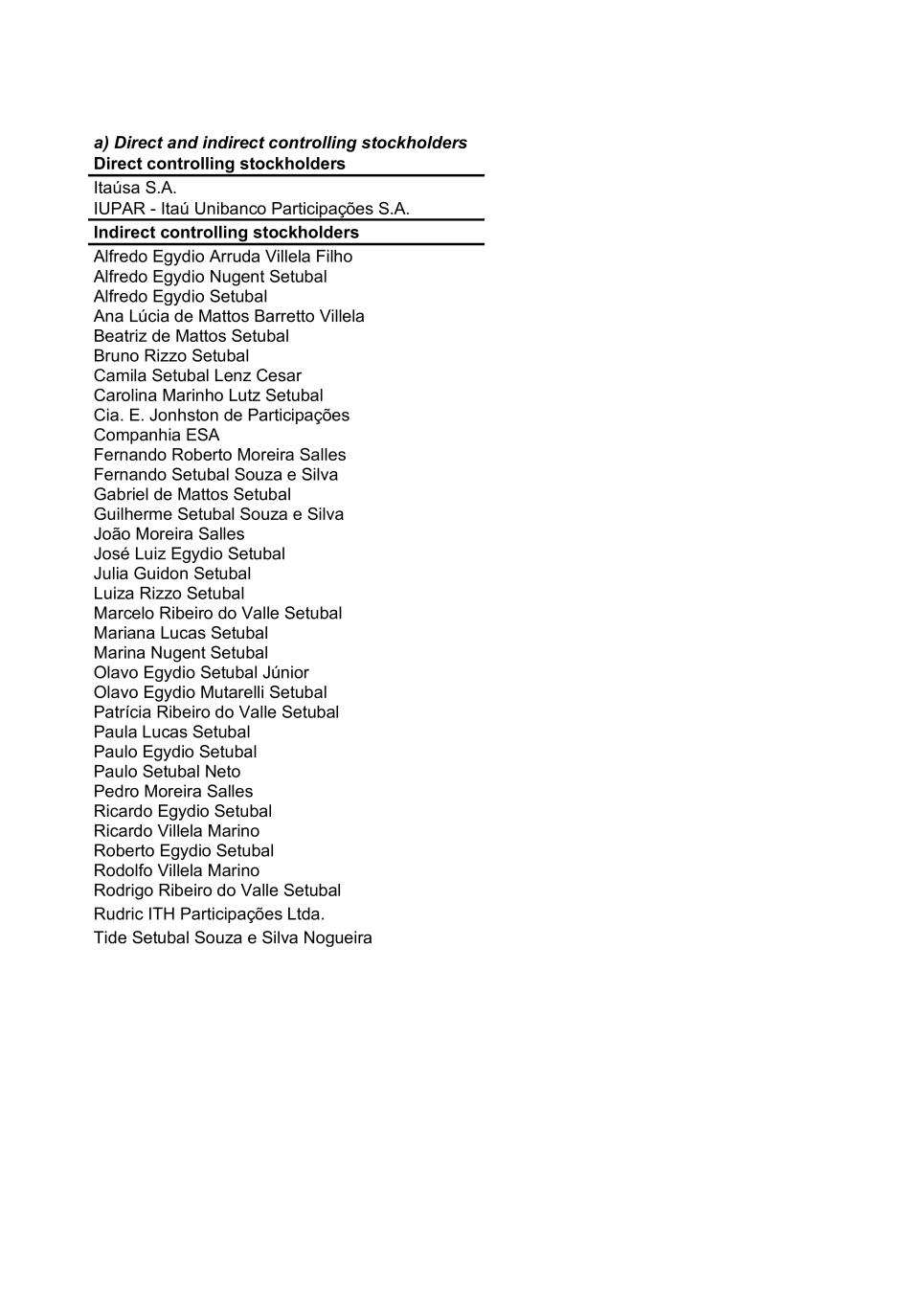 a) Direct and indirect controlling stockholders Direct controlling stockholders Itaúsa S.A. IUPAR - Itaú Unibanco Participações S.A. lndirect controlling stockholders Alfredo Egydio Arruda Villela Filho Alfredo Egydio Nugent Setubal Alfredo Egydio Setubal Ana Lúcia de Mattos Barretto Villela Beatriz de Mattos Setubal Bruno Rizzo Setubal Camila Setubal Lenz Cesar Carolina Marinho Lutz Setubal Cia. E. Jonhston de Participações Companhia ESA Fernando Roberto Moreira Salles Fernando Setubal Souza e Silva Gabriel de Mattos Setubal Guilherme Setubal Souza e Silva João Moreira Salles José Luiz Egydio Setubal Julia Guidon Setubal Luiza Rizzo Setubal Marcelo Ribeiro do Valle Setubal Mariana Lucas Setubal Marina Nugent Setubal Olavo Egydio Setubal Júnior Olavo Egydio Mutarelli Setubal Patrícia Ribeiro do Valle Setubal Paula Lucas Setubal Paulo Egydio Setubal Paulo Setubal Neto Pedro Moreira Salles Ricardo Egydio Setubal Ricardo Villela Marino Roberto Egydio Setubal Rodolfo Villela Marino Rodrigo Ribeiro do Valle Setubal Rudric ITH Participações Ltda. Tide Setubal Souza e Silva Nogueira