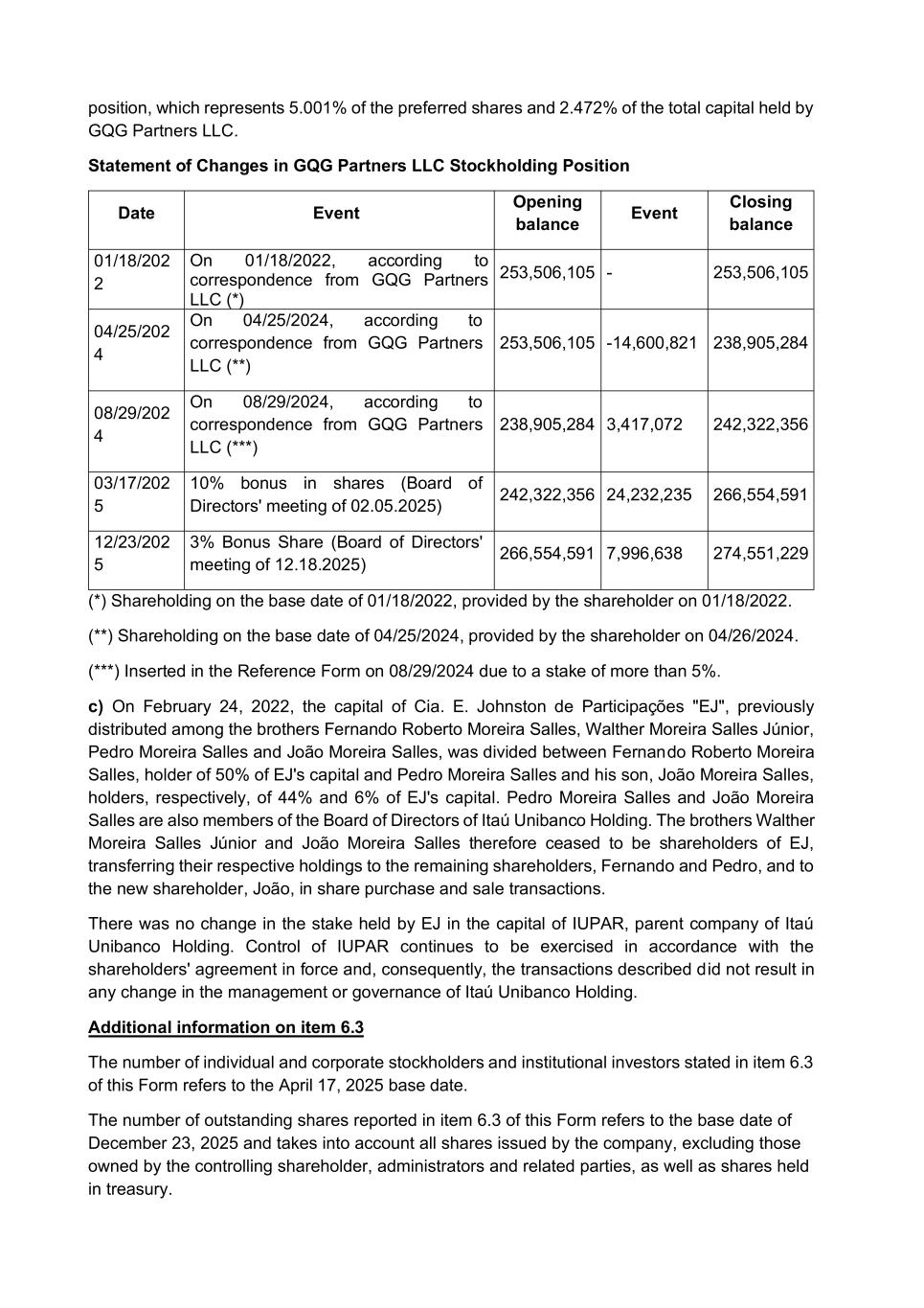 position, which represents 5.001% of the preferred shares and 2.472% of the total capital held by GQG Partners LLC. Statement of Changes in GQG Partners LLC Stockholding Position Date Event Opening balance Event Closing balance 01/18/202 2 On 01/18/2022, according to correspondence from GQG Partners LLC (*) 253,506,105 - 253,506,105 04/25/202 4 On 04/25/2024, according to correspondence from GQG Partners LLC (**) 253,506,105 -14,600,821 238,905,284 08/29/202 4 On 08/29/2024, according to correspondence from GQG Partners LLC (***) 238,905,284 3,417,072 242,322,356 03/17/202 5 10% bonus in shares (Board of Directors' meeting of 02.05.2025) 242,322,356 24,232,235 266,554,591 12/23/202 5 3% Bonus Share (Board of Directors' meeting of 12.18.2025) 266,554,591 7,996,638 274,551,229 (*) Shareholding on the base date of 01/18/2022, provided by the shareholder on 01/18/2022. (**) Shareholding on the base date of 04/25/2024, provided by the shareholder on 04/26/2024. (***) Inserted in the Reference Form on 08/29/2024 due to a stake of more than 5%. c) On February 24, 2022, the capital of Cia. E. Johnston de Participações "EJ", previously distributed among the brothers Fernando Roberto Moreira Salles, Walther Moreira Salles Júnior, Pedro Moreira Salles and João Moreira Salles, was divided between Fernando Roberto Moreira Salles, holder of 50% of EJ's capital and Pedro Moreira Salles and his son, João Moreira Salles, holders, respectively, of 44% and 6% of EJ's capital. Pedro Moreira Salles and João Moreira Salles are also members of the Board of Directors of Itaú Unibanco Holding. The brothers Walther Moreira Salles Júnior and João Moreira Salles therefore ceased to be shareholders of EJ, transferring their respective holdings to the remaining shareholders, Fernando and Pedro, and to the new shareholder, João, in share purchase and sale transactions. There was no change in the stake held by EJ in the capital of IUPAR, parent company of Itaú Unibanco Holding. Control of IUPAR continues to be exercised in accordance with the shareholders' agreement in force and, consequently, the transactions described did not result in any change in the management or governance of Itaú Unibanco Holding. Additional information on item 6.3 The number of individual and corporate stockholders and institutional investors stated in item 6.3 of this Form refers to the April 17, 2025 base date. The number of outstanding shares reported in item 6.3 of this Form refers to the base date of December 23, 2025 and takes into account all shares issued by the company, excluding those owned by the controlling shareholder, administrators and related parties, as well as shares held in treasury.