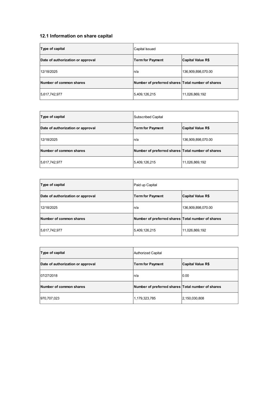 12.1 Information on share capital 12/18/2025 n/a 136,909,898,070.00 5,617,742,977 5,409,126,215 11,026,869,192 12/18/2025 n/a 136,909,898,070.00 5,617,742,977 5,409,126,215 11,026,869,192 12/18/2025 n/a 136,909,898,070.00 5,617,742,977 5,409,126,215 11,026,869,192 07/27/2018 n/a 0.00 970,707,023 1,179,323,785 2,150,030,808 Date of authorization or approval Term for Payment Capital Value R$ Number of common shares Number of preferred shares Total number of shares Number of common shares Number of preferred shares Total number of shares Type of capital Authorized Capital Type of capital Paid up Capital Date of authorization or approval Term for Payment Capital Value R$ Date of authorization or approval Term for Payment Capital Value R$ Number of common shares Number of preferred shares Total number of shares Total number of shares Capital Issued Capital Value R$ Type of capital Subscribed Capital Date of authorization or approval Term for Payment Number of common shares Number of preferred shares Type of capital