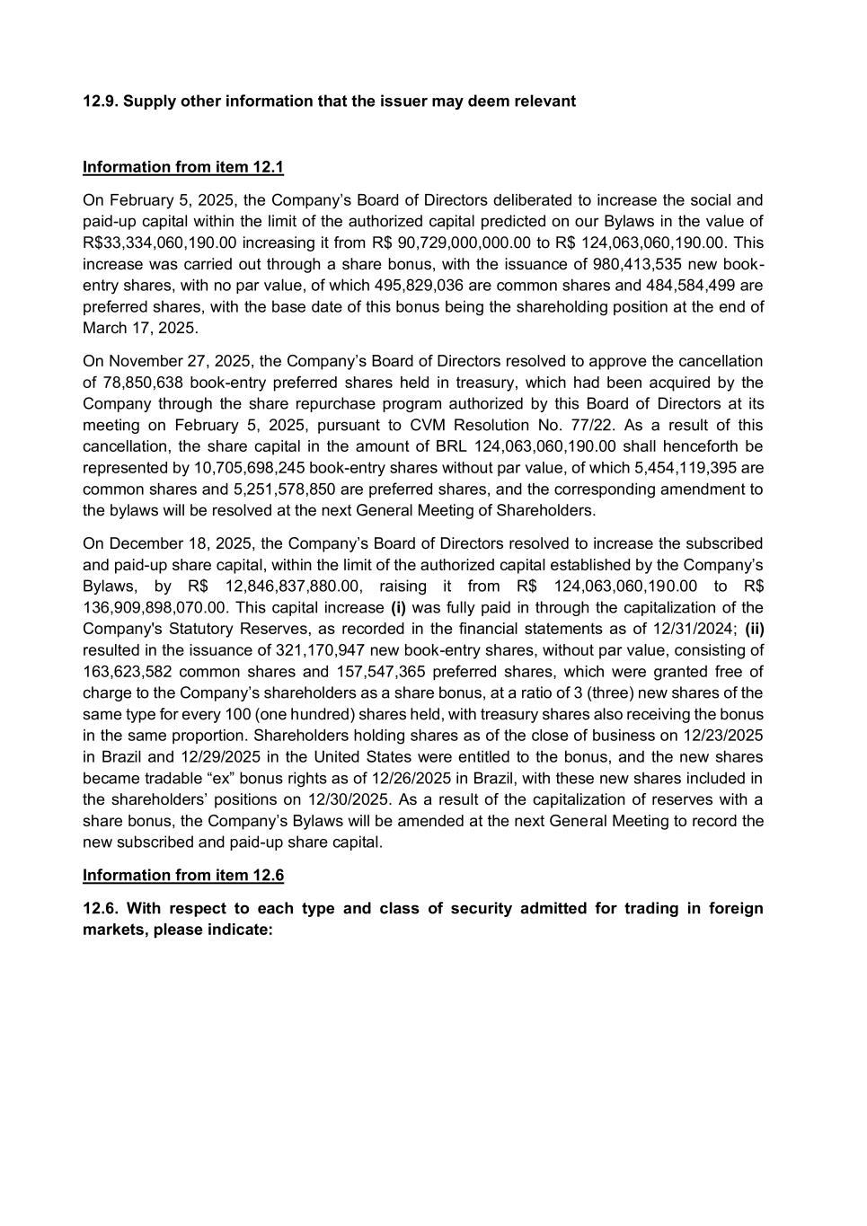 12.9. Supply other information that the issuer may deem relevant Information from item 12.1 On February 5, 2025, the Company’s Board of Directors deliberated to increase the social and paid-up capital within the limit of the authorized capital predicted on our Bylaws in the value of R$33,334,060,190.00 increasing it from R$ 90,729,000,000.00 to R$ 124,063,060,190.00. This increase was carried out through a share bonus, with the issuance of 980,413,535 new book- entry shares, with no par value, of which 495,829,036 are common shares and 484,584,499 are preferred shares, with the base date of this bonus being the shareholding position at the end of March 17, 2025. On November 27, 2025, the Company’s Board of Directors resolved to approve the cancellation of 78,850,638 book-entry preferred shares held in treasury, which had been acquired by the Company through the share repurchase program authorized by this Board of Directors at its meeting on February 5, 2025, pursuant to CVM Resolution No. 77/22. As a result of this cancellation, the share capital in the amount of BRL 124,063,060,190.00 shall henceforth be represented by 10,705,698,245 book-entry shares without par value, of which 5,454,119,395 are common shares and 5,251,578,850 are preferred shares, and the corresponding amendment to the bylaws will be resolved at the next General Meeting of Shareholders. On December 18, 2025, the Company’s Board of Directors resolved to increase the subscribed and paid-up share capital, within the limit of the authorized capital established by the Company’s Bylaws, by R$ 12,846,837,880.00, raising it from R$ 124,063,060,190.00 to R$ 136,909,898,070.00. This capital increase (i) was fully paid in through the capitalization of the Company's Statutory Reserves, as recorded in the financial statements as of 12/31/2024; (ii) resulted in the issuance of 321,170,947 new book-entry shares, without par value, consisting of 163,623,582 common shares and 157,547,365 preferred shares, which were granted free of charge to the Company’s shareholders as a share bonus, at a ratio of 3 (three) new shares of the same type for every 100 (one hundred) shares held, with treasury shares also receiving the bonus in the same proportion. Shareholders holding shares as of the close of business on 12/23/2025 in Brazil and 12/29/2025 in the United States were entitled to the bonus, and the new shares became tradable “ex” bonus rights as of 12/26/2025 in Brazil, with these new shares included in the shareholders’ positions on 12/30/2025. As a result of the capitalization of reserves with a share bonus, the Company’s Bylaws will be amended at the next General Meeting to record the new subscribed and paid-up share capital. Information from item 12.6 12.6. With respect to each type and class of security admitted for trading in foreign markets, please indicate:
