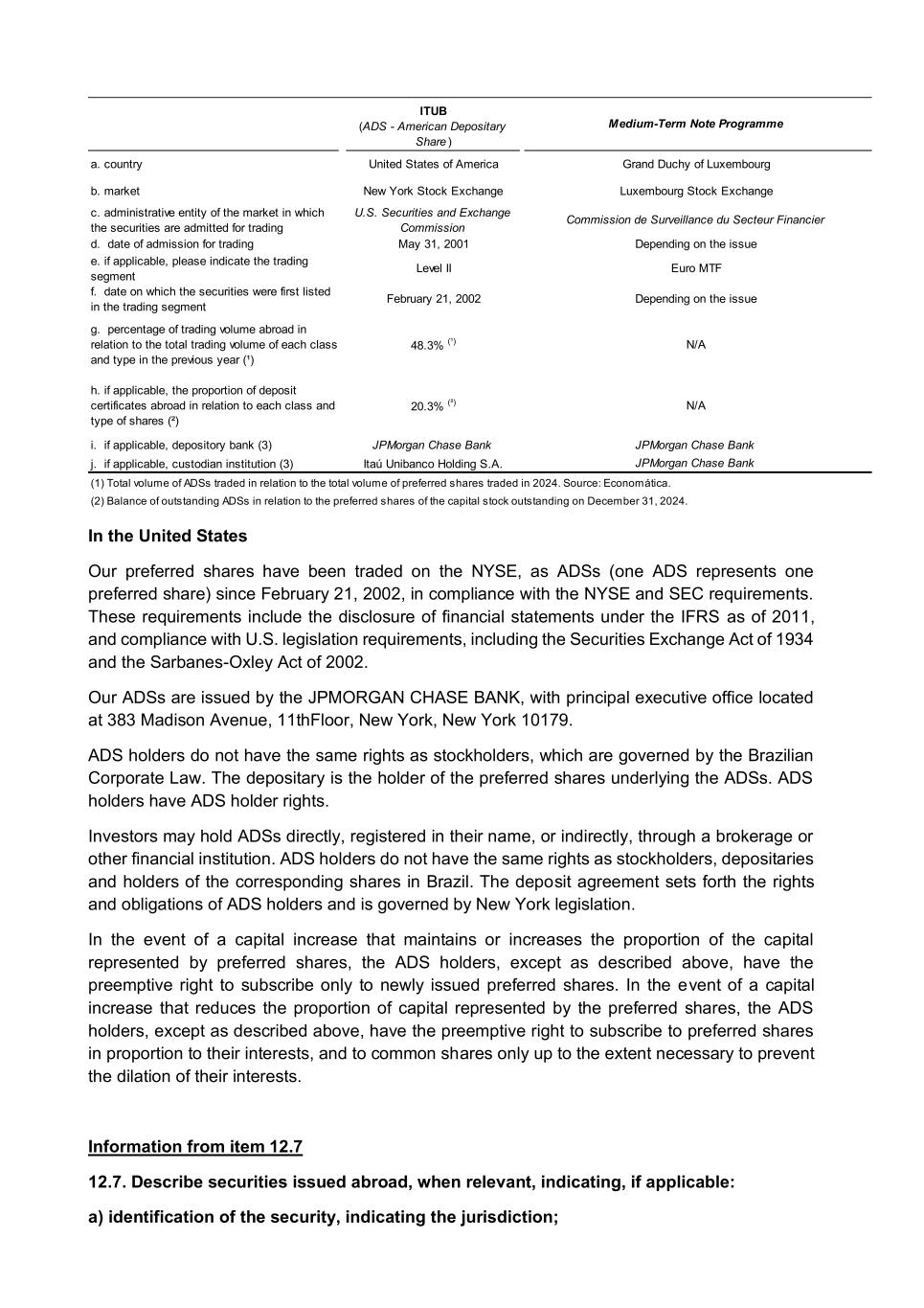 In the United States Our preferred shares have been traded on the NYSE, as ADSs (one ADS represents one preferred share) since February 21, 2002, in compliance with the NYSE and SEC requirements. These requirements include the disclosure of financial statements under the IFRS as of 2011, and compliance with U.S. legislation requirements, including the Securities Exchange Act of 1934 and the Sarbanes-Oxley Act of 2002. Our ADSs are issued by the JPMORGAN CHASE BANK, with principal executive office located at 383 Madison Avenue, 11thFloor, New York, New York 10179. ADS holders do not have the same rights as stockholders, which are governed by the Brazilian Corporate Law. The depositary is the holder of the preferred shares underlying the ADSs. ADS holders have ADS holder rights. Investors may hold ADSs directly, registered in their name, or indirectly, through a brokerage or other financial institution. ADS holders do not have the same rights as stockholders, depositaries and holders of the corresponding shares in Brazil. The deposit agreement sets forth the rights and obligations of ADS holders and is governed by New York legislation. In the event of a capital increase that maintains or increases the proportion of the capital represented by preferred shares, the ADS holders, except as described above, have the preemptive right to subscribe only to newly issued preferred shares. In the event of a capital increase that reduces the proportion of capital represented by the preferred shares, the ADS holders, except as described above, have the preemptive right to subscribe to preferred shares in proportion to their interests, and to common shares only up to the extent necessary to prevent the dilation of their interests. Information from item 12.7 12.7. Describe securities issued abroad, when relevant, indicating, if applicable: a) identification of the security, indicating the jurisdiction; ITUB (ADS - American Depositary Share ) a. country United States of America b. market New York Stock Exchange c. administrative entity of the market in which the securities are admitted for trading U.S. Securities and Exchange Commission d.  date of admission for trading May 31, 2001 e. if applicable, please indicate the trading segment Level II f.  date on which the securities were first listed in the trading segment February 21, 2002 g.  percentage of trading volume abroad in relation to the total trading volume of each class and type in the previous year (¹) 48.3% (¹) h. if applicable, the proportion of deposit certificates abroad in relation to each class and type of shares (²) 20.3% (²) i.  if applicable, depository bank (3) JPMorgan Chase Bank j.  if applicable, custodian institution (3) Itaú Unibanco Holding S.A. (1) Total volume of ADSs traded in relation to the total volume of preferred shares traded in 2024. Source: Economática. (2) Balance of outstanding ADSs in relation to the preferred shares of the capital stock outstanding on December 31, 2024. Medium-Term Note Programme Euro MTF Depending on the issue N/A N/A JPMorgan Chase Bank JPMorgan Chase Bank Grand Duchy of Luxembourg Luxembourg Stock Exchange Commission de Surveillance du Secteur Financier Depending on the issue