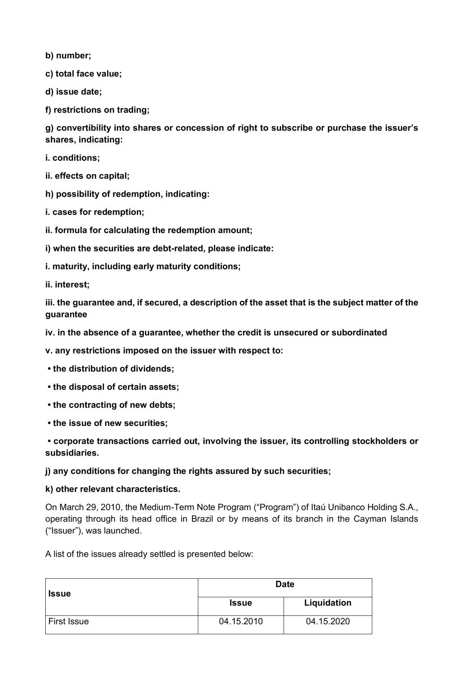 b) number; c) total face value; d) issue date; f) restrictions on trading; g) convertibility into shares or concession of right to subscribe or purchase the issuer’s shares, indicating: i. conditions; ii. effects on capital; h) possibility of redemption, indicating: i. cases for redemption; ii. formula for calculating the redemption amount; i) when the securities are debt-related, please indicate: i. maturity, including early maturity conditions; ii. interest; iii. the guarantee and, if secured, a description of the asset that is the subject matter of the guarantee iv. in the absence of a guarantee, whether the credit is unsecured or subordinated v. any restrictions imposed on the issuer with respect to: • the distribution of dividends; • the disposal of certain assets; • the contracting of new debts; • the issue of new securities; • corporate transactions carried out, involving the issuer, its controlling stockholders or subsidiaries. j) any conditions for changing the rights assured by such securities; k) other relevant characteristics. On March 29, 2010, the Medium-Term Note Program (“Program”) of Itaú Unibanco Holding S.A., operating through its head office in Brazil or by means of its branch in the Cayman Islands (“Issuer”), was launched. A list of the issues already settled is presented below: Issue Date Issue Liquidation First Issue 04.15.2010 04.15.2020