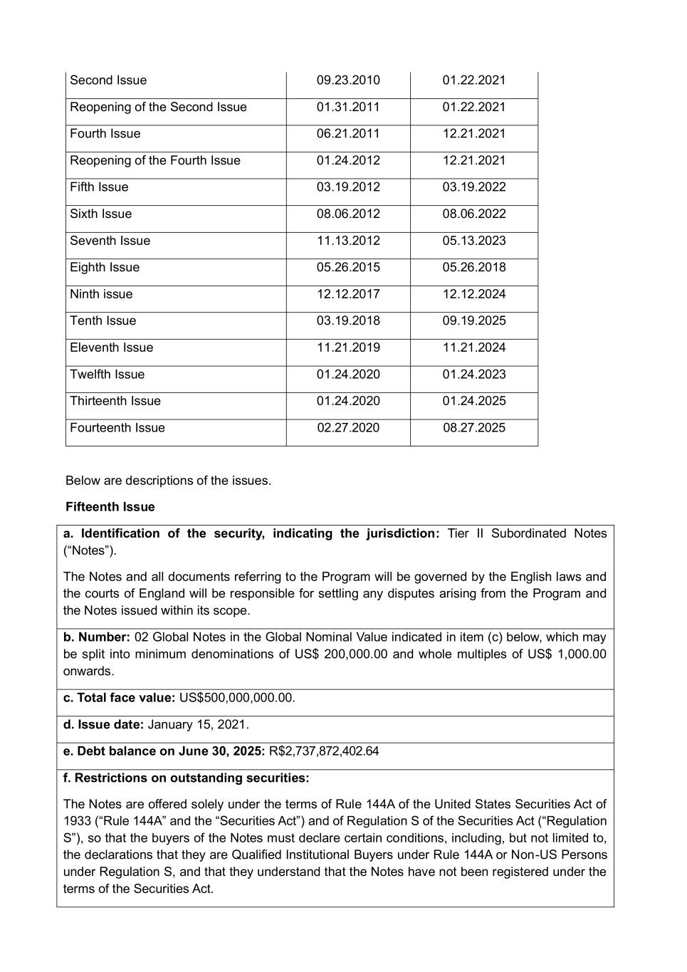 Second Issue 09.23.2010 01.22.2021 Reopening of the Second Issue 01.31.2011 01.22.2021 Fourth Issue 06.21.2011 12.21.2021 Reopening of the Fourth Issue 01.24.2012 12.21.2021 Fifth Issue 03.19.2012 03.19.2022 Sixth Issue 08.06.2012 08.06.2022 Seventh Issue 11.13.2012 05.13.2023 Eighth Issue 05.26.2015 05.26.2018 Ninth issue 12.12.2017 12.12.2024 Tenth Issue 03.19.2018 09.19.2025 Eleventh Issue 11.21.2019 11.21.2024 Twelfth Issue 01.24.2020 01.24.2023 Thirteenth Issue 01.24.2020 01.24.2025 Fourteenth Issue 02.27.2020 08.27.2025 Below are descriptions of the issues. Fifteenth Issue a. Identification of the security, indicating the jurisdiction: Tier II Subordinated Notes (“Notes”). The Notes and all documents referring to the Program will be governed by the English laws and the courts of England will be responsible for settling any disputes arising from the Program and the Notes issued within its scope. b. Number: 02 Global Notes in the Global Nominal Value indicated in item (c) below, which may be split into minimum denominations of US$ 200,000.00 and whole multiples of US$ 1,000.00 onwards. c. Total face value: US$500,000,000.00. d. Issue date: January 15, 2021. e. Debt balance on June 30, 2025: R$2,737,872,402.64 f. Restrictions on outstanding securities: The Notes are offered solely under the terms of Rule 144A of the United States Securities Act of 1933 (“Rule 144A” and the “Securities Act”) and of Regulation S of the Securities Act (“Regulation S”), so that the buyers of the Notes must declare certain conditions, including, but not limited to, the declarations that they are Qualified Institutional Buyers under Rule 144A or Non-US Persons under Regulation S, and that they understand that the Notes have not been registered under the terms of the Securities Act.