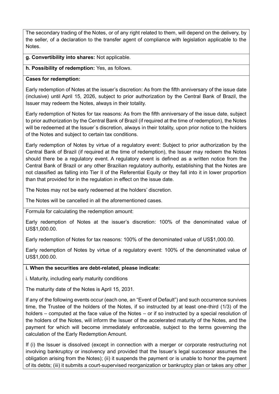 The secondary trading of the Notes, or of any right related to them, will depend on the delivery, by the seller, of a declaration to the transfer agent of compliance with legislation applicable to the Notes. g. Convertibility into shares: Not applicable. h. Possibility of redemption: Yes, as follows. Cases for redemption: Early redemption of Notes at the issuer’s discretion: As from the fifth anniversary of the issue date (inclusive) until April 15, 2026, subject to prior authorization by the Central Bank of Brazil, the Issuer may redeem the Notes, always in their totality. Early redemption of Notes for tax reasons: As from the fifth anniversary of the issue date, subject to prior authorization by the Central Bank of Brazil (if required at the time of redemption), the Notes will be redeemed at the Issuer`s discretion, always in their totality, upon prior notice to the holders of the Notes and subject to certain tax conditions. Early redemption of Notes by virtue of a regulatory event: Subject to prior authorization by the Central Bank of Brazil (if required at the time of redemption), the Issuer may redeem the Notes should there be a regulatory event. A regulatory event is defined as a written notice from the Central Bank of Brazil or any other Brazilian regulatory authority, establishing that the Notes are not classified as falling into Tier II of the Referential Equity or they fall into it in lower proportion than that provided for in the regulation in effect on the issue date. The Notes may not be early redeemed at the holders’ discretion. The Notes will be cancelled in all the aforementioned cases. Formula for calculating the redemption amount: Early redemption of Notes at the issuer’s discretion: 100% of the denominated value of US$1,000.00. Early redemption of Notes for tax reasons: 100% of the denominated value of US$1,000.00. Early redemption of Notes by virtue of a regulatory event: 100% of the denominated value of US$1,000.00. i. When the securities are debt-related, please indicate: i. Maturity, including early maturity conditions The maturity date of the Notes is April 15, 2031. If any of the following events occur (each one, an “Event of Default”) and such occurrence survives time, the Trustee of the holders of the Notes, if so instructed by at least one-third (1/3) of the holders – computed at the face value of the Notes – or if so instructed by a special resolution of the holders of the Notes, will inform the Issuer of the accelerated maturity of the Notes, and the payment for which will become immediately enforceable, subject to the terms governing the calculation of the Early Redemption Amount. If (i) the Issuer is dissolved (except in connection with a merger or corporate restructuring not involving bankruptcy or insolvency and provided that the Issuer’s legal successor assumes the obligation arising from the Notes); (ii) it suspends the payment or is unable to honor the payment of its debts; (iii) it submits a court-supervised reorganization or bankruptcy plan or takes any other