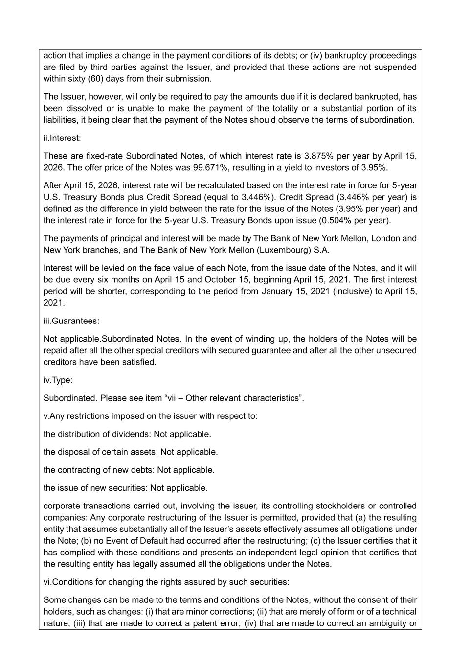action that implies a change in the payment conditions of its debts; or (iv) bankruptcy proceedings are filed by third parties against the Issuer, and provided that these actions are not suspended within sixty (60) days from their submission. The Issuer, however, will only be required to pay the amounts due if it is declared bankrupted, has been dissolved or is unable to make the payment of the totality or a substantial portion of its liabilities, it being clear that the payment of the Notes should observe the terms of subordination. ii.Interest: These are fixed-rate Subordinated Notes, of which interest rate is 3.875% per year by April 15, 2026. The offer price of the Notes was 99.671%, resulting in a yield to investors of 3.95%. After April 15, 2026, interest rate will be recalculated based on the interest rate in force for 5-year U.S. Treasury Bonds plus Credit Spread (equal to 3.446%). Credit Spread (3.446% per year) is defined as the difference in yield between the rate for the issue of the Notes (3.95% per year) and the interest rate in force for the 5-year U.S. Treasury Bonds upon issue (0.504% per year). The payments of principal and interest will be made by The Bank of New York Mellon, London and New York branches, and The Bank of New York Mellon (Luxembourg) S.A. Interest will be levied on the face value of each Note, from the issue date of the Notes, and it will be due every six months on April 15 and October 15, beginning April 15, 2021. The first interest period will be shorter, corresponding to the period from January 15, 2021 (inclusive) to April 15, 2021. iii.Guarantees: Not applicable.Subordinated Notes. In the event of winding up, the holders of the Notes will be repaid after all the other special creditors with secured guarantee and after all the other unsecured creditors have been satisfied. iv.Type: Subordinated. Please see item “vii – Other relevant characteristics”. v.Any restrictions imposed on the issuer with respect to: the distribution of dividends: Not applicable. the disposal of certain assets: Not applicable. the contracting of new debts: Not applicable. the issue of new securities: Not applicable. corporate transactions carried out, involving the issuer, its controlling stockholders or controlled companies: Any corporate restructuring of the Issuer is permitted, provided that (a) the resulting entity that assumes substantially all of the Issuer’s assets effectively assumes all obligations under the Note; (b) no Event of Default had occurred after the restructuring; (c) the Issuer certifies that it has complied with these conditions and presents an independent legal opinion that certifies that the resulting entity has legally assumed all the obligations under the Notes. vi.Conditions for changing the rights assured by such securities: Some changes can be made to the terms and conditions of the Notes, without the consent of their holders, such as changes: (i) that are minor corrections; (ii) that are merely of form or of a technical nature; (iii) that are made to correct a patent error; (iv) that are made to correct an ambiguity or