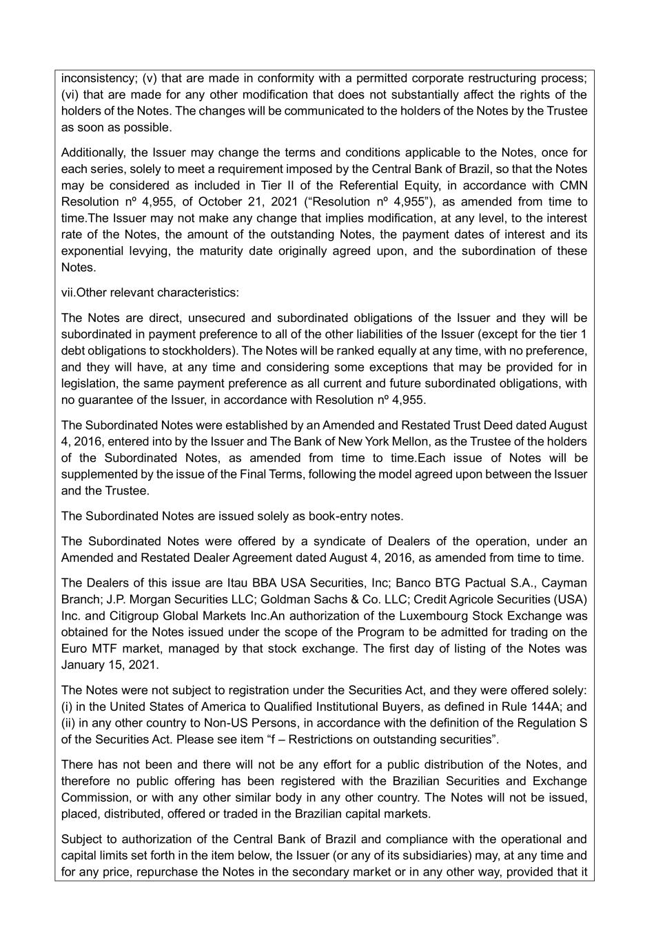 inconsistency; (v) that are made in conformity with a permitted corporate restructuring process; (vi) that are made for any other modification that does not substantially affect the rights of the holders of the Notes. The changes will be communicated to the holders of the Notes by the Trustee as soon as possible. Additionally, the Issuer may change the terms and conditions applicable to the Notes, once for each series, solely to meet a requirement imposed by the Central Bank of Brazil, so that the Notes may be considered as included in Tier II of the Referential Equity, in accordance with CMN Resolution nº 4,955, of October 21, 2021 (“Resolution nº 4,955”), as amended from time to time.The Issuer may not make any change that implies modification, at any level, to the interest rate of the Notes, the amount of the outstanding Notes, the payment dates of interest and its exponential levying, the maturity date originally agreed upon, and the subordination of these Notes. vii.Other relevant characteristics: The Notes are direct, unsecured and subordinated obligations of the Issuer and they will be subordinated in payment preference to all of the other liabilities of the Issuer (except for the tier 1 debt obligations to stockholders). The Notes will be ranked equally at any time, with no preference, and they will have, at any time and considering some exceptions that may be provided for in legislation, the same payment preference as all current and future subordinated obligations, with no guarantee of the Issuer, in accordance with Resolution nº 4,955. The Subordinated Notes were established by an Amended and Restated Trust Deed dated August 4, 2016, entered into by the Issuer and The Bank of New York Mellon, as the Trustee of the holders of the Subordinated Notes, as amended from time to time.Each issue of Notes will be supplemented by the issue of the Final Terms, following the model agreed upon between the Issuer and the Trustee. The Subordinated Notes are issued solely as book-entry notes. The Subordinated Notes were offered by a syndicate of Dealers of the operation, under an Amended and Restated Dealer Agreement dated August 4, 2016, as amended from time to time. The Dealers of this issue are Itau BBA USA Securities, Inc; Banco BTG Pactual S.A., Cayman Branch; J.P. Morgan Securities LLC; Goldman Sachs & Co. LLC; Credit Agricole Securities (USA) Inc. and Citigroup Global Markets Inc.An authorization of the Luxembourg Stock Exchange was obtained for the Notes issued under the scope of the Program to be admitted for trading on the Euro MTF market, managed by that stock exchange. The first day of listing of the Notes was January 15, 2021. The Notes were not subject to registration under the Securities Act, and they were offered solely: (i) in the United States of America to Qualified Institutional Buyers, as defined in Rule 144A; and (ii) in any other country to Non-US Persons, in accordance with the definition of the Regulation S of the Securities Act. Please see item “f – Restrictions on outstanding securities”. There has not been and there will not be any effort for a public distribution of the Notes, and therefore no public offering has been registered with the Brazilian Securities and Exchange Commission, or with any other similar body in any other country. The Notes will not be issued, placed, distributed, offered or traded in the Brazilian capital markets. Subject to authorization of the Central Bank of Brazil and compliance with the operational and capital limits set forth in the item below, the Issuer (or any of its subsidiaries) may, at any time and for any price, repurchase the Notes in the secondary market or in any other way, provided that it