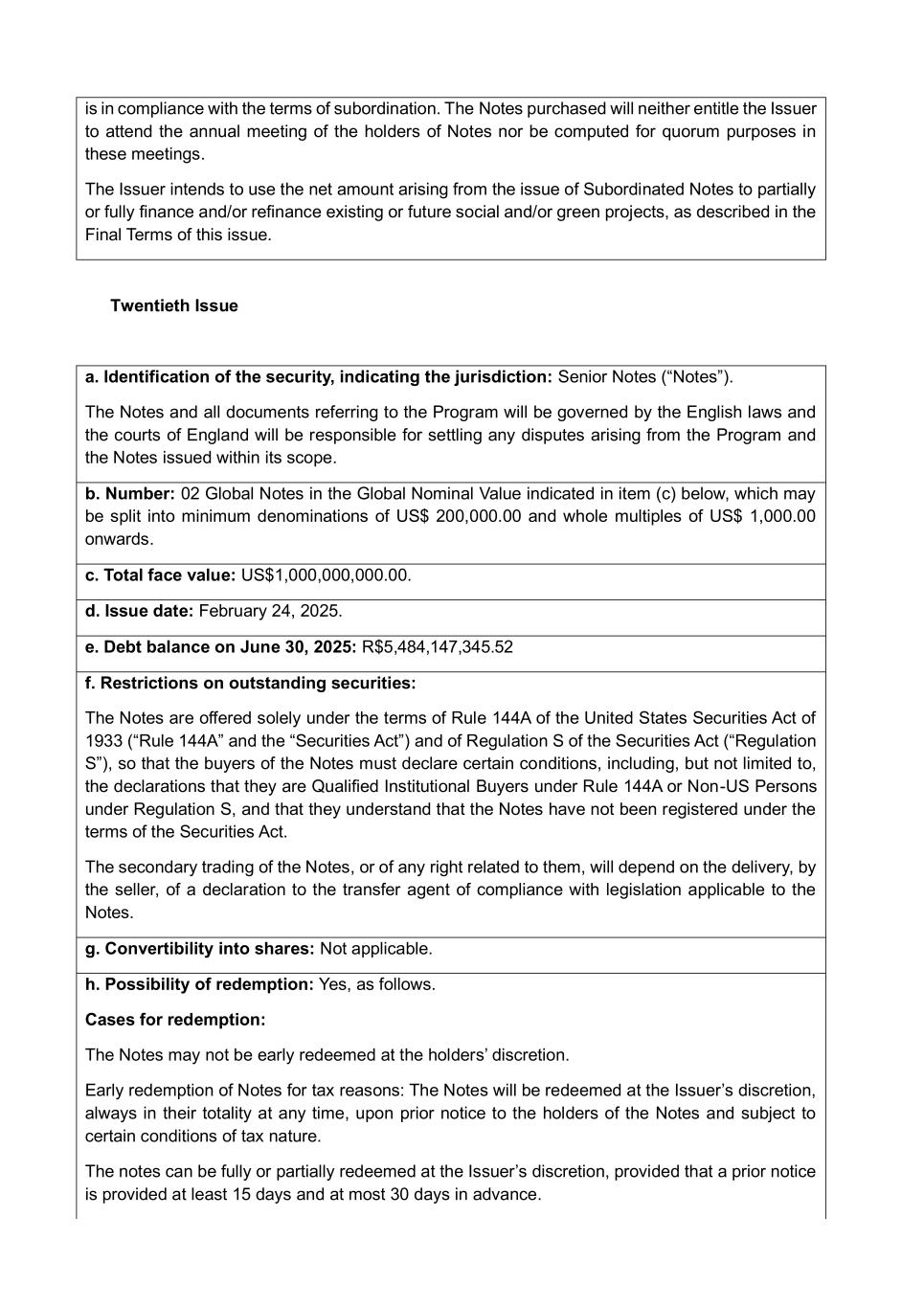 is in compliance with the terms of subordination. The Notes purchased will neither entitle the Issuer to attend the annual meeting of the holders of Notes nor be computed for quorum purposes in these meetings. The Issuer intends to use the net amount arising from the issue of Subordinated Notes to partially or fully finance and/or refinance existing or future social and/or green projects, as described in the Final Terms of this issue. Twentieth Issue a. Identification of the security, indicating the jurisdiction: Senior Notes (“Notes”). The Notes and all documents referring to the Program will be governed by the English laws and the courts of England will be responsible for settling any disputes arising from the Program and the Notes issued within its scope. b. Number: 02 Global Notes in the Global Nominal Value indicated in item (c) below, which may be split into minimum denominations of US$ 200,000.00 and whole multiples of US$ 1,000.00 onwards. c. Total face value: US$1,000,000,000.00. d. Issue date: February 24, 2025. e. Debt balance on June 30, 2025: R$5,484,147,345.52 f. Restrictions on outstanding securities: The Notes are offered solely under the terms of Rule 144A of the United States Securities Act of 1933 (“Rule 144A” and the “Securities Act”) and of Regulation S of the Securities Act (“Regulation S”), so that the buyers of the Notes must declare certain conditions, including, but not limited to, the declarations that they are Qualified Institutional Buyers under Rule 144A or Non-US Persons under Regulation S, and that they understand that the Notes have not been registered under the terms of the Securities Act. The secondary trading of the Notes, or of any right related to them, will depend on the delivery, by the seller, of a declaration to the transfer agent of compliance with legislation applicable to the Notes. g. Convertibility into shares: Not applicable. h. Possibility of redemption: Yes, as follows. Cases for redemption: The Notes may not be early redeemed at the holders’ discretion. Early redemption of Notes for tax reasons: The Notes will be redeemed at the Issuer’s discretion, always in their totality at any time, upon prior notice to the holders of the Notes and subject to certain conditions of tax nature. The notes can be fully or partially redeemed at the Issuer’s discretion, provided that a prior notice is provided at least 15 days and at most 30 days in advance.