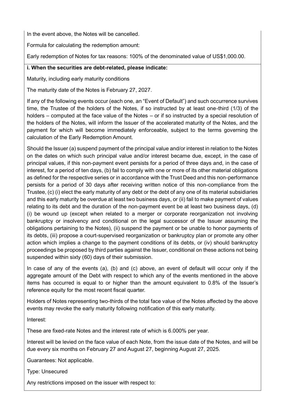 In the event above, the Notes will be cancelled. Formula for calculating the redemption amount: Early redemption of Notes for tax reasons: 100% of the denominated value of US$1,000.00. i. When the securities are debt-related, please indicate: Maturity, including early maturity conditions The maturity date of the Notes is February 27, 2027. If any of the following events occur (each one, an “Event of Default”) and such occurrence survives time, the Trustee of the holders of the Notes, if so instructed by at least one-third (1/3) of the holders – computed at the face value of the Notes – or if so instructed by a special resolution of the holders of the Notes, will inform the Issuer of the accelerated maturity of the Notes, and the payment for which will become immediately enforceable, subject to the terms governing the calculation of the Early Redemption Amount. Should the Issuer (a) suspend payment of the principal value and/or interest in relation to the Notes on the dates on which such principal value and/or interest became due, except, in the case of principal values, if this non-payment event persists for a period of three days and, in the case of interest, for a period of ten days, (b) fail to comply with one or more of its other material obligations as defined for the respective series or in accordance with the Trust Deed and this non-performance persists for a period of 30 days after receiving written notice of this non-compliance from the Trustee, (c) (i) elect the early maturity of any debt or the debt of any one of its material subsidiaries and this early maturity be overdue at least two business days, or (ii) fail to make payment of values relating to its debt and the duration of the non-payment event be at least two business days, (d) (i) be wound up (except when related to a merger or corporate reorganization not involving bankruptcy or insolvency and conditional on the legal successor of the Issuer assuming the obligations pertaining to the Notes), (ii) suspend the payment or be unable to honor payments of its debts, (iii) propose a court-supervised reorganization or bankruptcy plan or promote any other action which implies a change to the payment conditions of its debts, or (iv) should bankruptcy proceedings be proposed by third parties against the Issuer, conditional on these actions not being suspended within sixty (60) days of their submission. In case of any of the events (a), (b) and (c) above, an event of default will occur only if the aggregate amount of the Debt with respect to which any of the events mentioned in the above items has occurred is equal to or higher than the amount equivalent to 0.8% of the Issuer’s reference equity for the most recent fiscal quarter. Holders of Notes representing two-thirds of the total face value of the Notes affected by the above events may revoke the early maturity following notification of this early maturity. Interest: These are fixed-rate Notes and the interest rate of which is 6.000% per year. Interest will be levied on the face value of each Note, from the issue date of the Notes, and will be due every six months on February 27 and August 27, beginning August 27, 2025. Guarantees: Not applicable. Type: Unsecured Any restrictions imposed on the issuer with respect to: