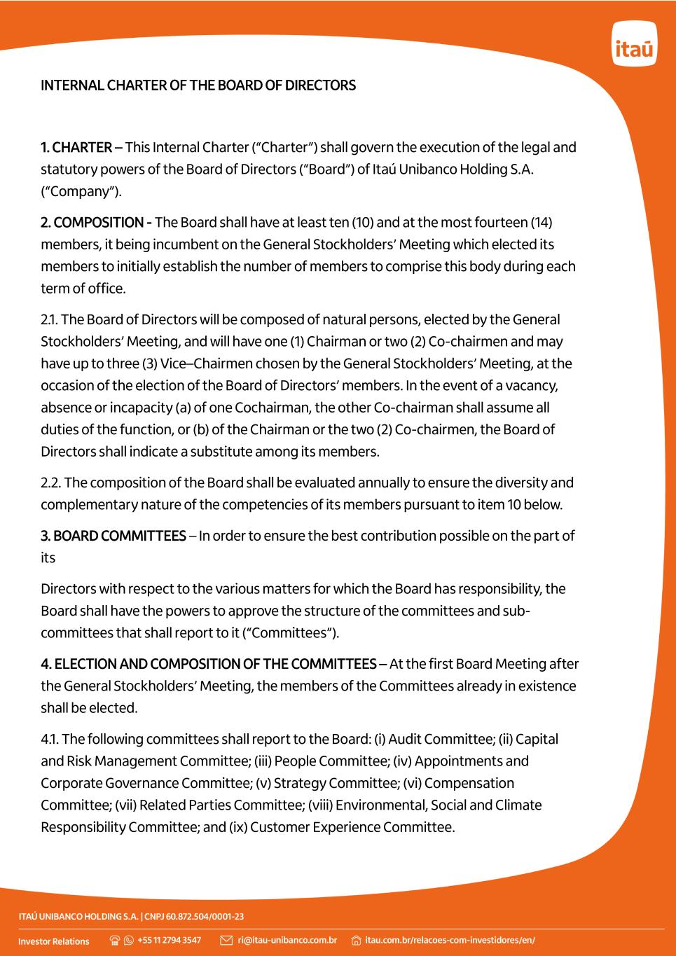 INTERNAL CHARTER OF THE BOARD OF DIRECTORS 1. CHARTER – This Internal Charter (“Charter”) shall govern the execution of the legal and statutory powers of the Board of Directors (“Board”) of Itaú Unibanco Holding S.A. (“Company”). 2. COMPOSITION - The Board shall have at least ten (10) and at the most fourteen (14) members, it being incumbent on the General Stockholders’ Meeting which elected its members to initially establish the number of members to comprise this body during each term of office. 2.1. The Board of Directors will be composed of natural persons, elected by the General Stockholders’ Meeting, and will have one (1) Chairman or two (2) Co-chairmen and may have up to three (3) Vice–Chairmen chosen by the General Stockholders’ Meeting, at the occasion of the election of the Board of Directors’ members. In the event of a vacancy, absence or incapacity (a) of one Cochairman, the other Co-chairman shall assume all duties of the function, or (b) of the Chairman or the two (2) Co-chairmen, the Board of Directors shall indicate a substitute among its members. 2.2. The composition of the Board shall be evaluated annually to ensure the diversity and complementary nature of the competencies of its members pursuant to item 10 below. 3. BOARD COMMITTEES – In order to ensure the best contribution possible on the part of its Directors with respect to the various matters for which the Board has responsibility, the Board shall have the powers to approve the structure of the committees and sub- committees that shall report to it (“Committees”). 4. ELECTION AND COMPOSITION OF THE COMMITTEES – At the first Board Meeting after the General Stockholders’ Meeting, the members of the Committees already in existence shall be elected. 4.1. The following committees shall report to the Board: (i) Audit Committee; (ii) Capital and Risk Management Committee; (iii) People Committee; (iv) Appointments and Corporate Governance Committee; (v) Strategy Committee; (vi) Compensation Committee; (vii) Related Parties Committee; (viii) Environmental, Social and Climate Responsibility Committee; and (ix) Customer Experience Committee.