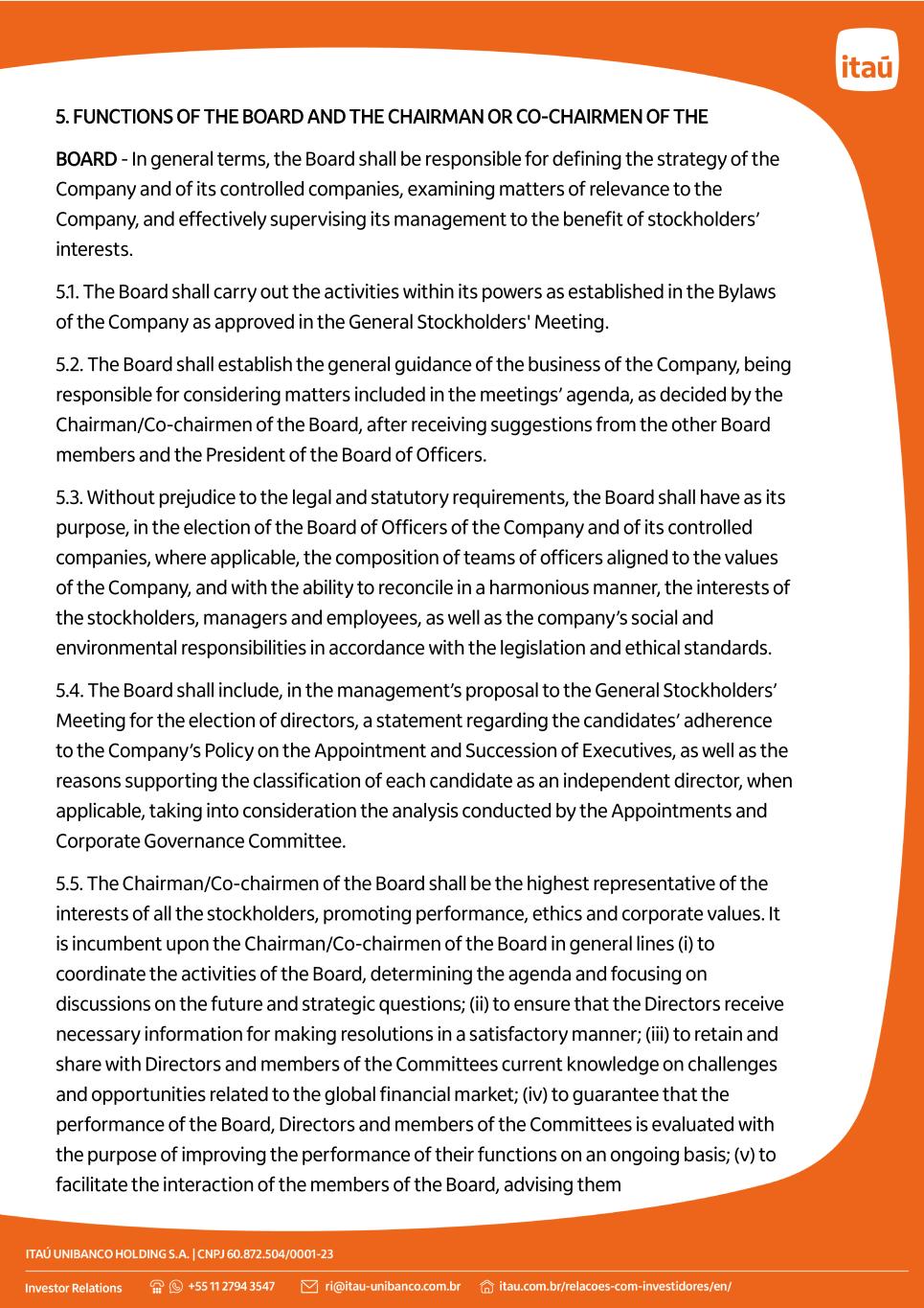 5. FUNCTIONS OF THE BOARD AND THE CHAIRMAN OR CO-CHAIRMEN OF THE BOARD - In general terms, the Board shall be responsible for defining the strategy of the Company and of its controlled companies, examining matters of relevance to the Company, and effectively supervising its management to the benefit of stockholders’ interests. 5.1. The Board shall carry out the activities within its powers as established in the Bylaws of the Company as approved in the General Stockholders' Meeting. 5.2. The Board shall establish the general guidance of the business of the Company, being responsible for considering matters included in the meetings’ agenda, as decided by the Chairman/Co-chairmen of the Board, after receiving suggestions from the other Board members and the President of the Board of Officers. 5.3. Without prejudice to the legal and statutory requirements, the Board shall have as its purpose, in the election of the Board of Officers of the Company and of its controlled companies, where applicable, the composition of teams of officers aligned to the values of the Company, and with the ability to reconcile in a harmonious manner, the interests of the stockholders, managers and employees, as well as the company’s social and environmental responsibilities in accordance with the legislation and ethical standards. 5.4. The Board shall include, in the management’s proposal to the General Stockholders’ Meeting for the election of directors, a statement regarding the candidates’ adherence to the Company’s Policy on the Appointment and Succession of Executives, as well as the reasons supporting the classification of each candidate as an independent director, when applicable, taking into consideration the analysis conducted by the Appointments and Corporate Governance Committee. 5.5. The Chairman/Co-chairmen of the Board shall be the highest representative of the interests of all the stockholders, promoting performance, ethics and corporate values. It is incumbent upon the Chairman/Co-chairmen of the Board in general lines (i) to coordinate the activities of the Board, determining the agenda and focusing on discussions on the future and strategic questions; (ii) to ensure that the Directors receive necessary information for making resolutions in a satisfactory manner; (iii) to retain and share with Directors and members of the Committees current knowledge on challenges and opportunities related to the global financial market; (iv) to guarantee that the performance of the Board, Directors and members of the Committees is evaluated with the purpose of improving the performance of their functions on an ongoing basis; (v) to facilitate the interaction of the members of the Board, advising them