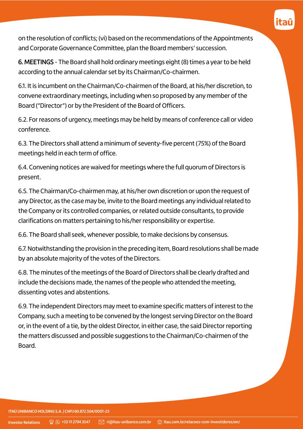 on the resolution of conflicts; (vi) based on the recommendations of the Appointments and Corporate Governance Committee, plan the Board members’ succession. 6. MEETINGS - The Board shall hold ordinary meetings eight (8) times a year to be held according to the annual calendar set by its Chairman/Co-chairmen. 6.1. It is incumbent on the Chairman/Co-chairmen of the Board, at his/her discretion, to convene extraordinary meetings, including when so proposed by any member of the Board (“Director”) or by the President of the Board of Officers. 6.2. For reasons of urgency, meetings may be held by means of conference call or video conference. 6.3. The Directors shall attend a minimum of seventy-five percent (75%) of the Board meetings held in each term of office. 6.4. Convening notices are waived for meetings where the full quorum of Directors is present. 6.5. The Chairman/Co-chairmen may, at his/her own discretion or upon the request of any Director, as the case may be, invite to the Board meetings any individual related to the Company or its controlled companies, or related outside consultants, to provide clarifications on matters pertaining to his/her responsibility or expertise. 6.6. The Board shall seek, whenever possible, to make decisions by consensus. 6.7. Notwithstanding the provision in the preceding item, Board resolutions shall be made by an absolute majority of the votes of the Directors. 6.8. The minutes of the meetings of the Board of Directors shall be clearly drafted and include the decisions made, the names of the people who attended the meeting, dissenting votes and abstentions. 6.9. The independent Directors may meet to examine specific matters of interest to the Company, such a meeting to be convened by the longest serving Director on the Board or, in the event of a tie, by the oldest Director, in either case, the said Director reporting the matters discussed and possible suggestions to the Chairman/Co-chairmen of the Board.