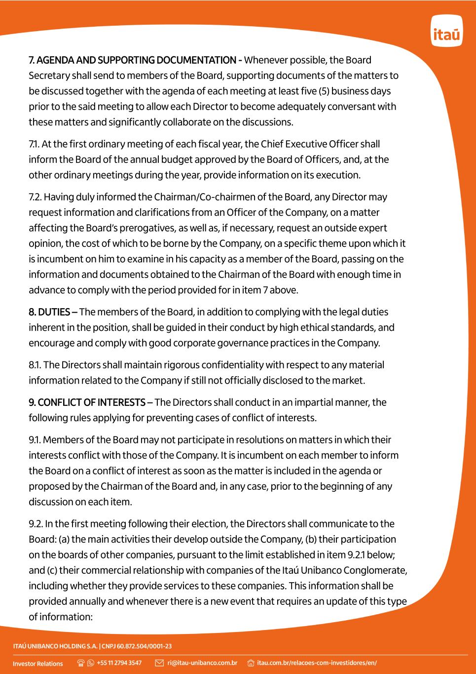 7. AGENDA AND SUPPORTING DOCUMENTATION - Whenever possible, the Board Secretary shall send to members of the Board, supporting documents of the matters to be discussed together with the agenda of each meeting at least five (5) business days prior to the said meeting to allow each Director to become adequately conversant with these matters and significantly collaborate on the discussions. 7.1. At the first ordinary meeting of each fiscal year, the Chief Executive Officer shall inform the Board of the annual budget approved by the Board of Officers, and, at the other ordinary meetings during the year, provide information on its execution. 7.2. Having duly informed the Chairman/Co-chairmen of the Board, any Director may request information and clarifications from an Officer of the Company, on a matter affecting the Board’s prerogatives, as well as, if necessary, request an outside expert opinion, the cost of which to be borne by the Company, on a specific theme upon which it is incumbent on him to examine in his capacity as a member of the Board, passing on the information and documents obtained to the Chairman of the Board with enough time in advance to comply with the period provided for in item 7 above. 8. DUTIES – The members of the Board, in addition to complying with the legal duties inherent in the position, shall be guided in their conduct by high ethical standards, and encourage and comply with good corporate governance practices in the Company. 8.1. The Directors shall maintain rigorous confidentiality with respect to any material information related to the Company if still not officially disclosed to the market. 9. CONFLICT OF INTERESTS – The Directors shall conduct in an impartial manner, the following rules applying for preventing cases of conflict of interests. 9.1. Members of the Board may not participate in resolutions on matters in which their interests conflict with those of the Company. It is incumbent on each member to inform the Board on a conflict of interest as soon as the matter is included in the agenda or proposed by the Chairman of the Board and, in any case, prior to the beginning of any discussion on each item. 9.2. In the first meeting following their election, the Directors shall communicate to the Board: (a) the main activities their develop outside the Company, (b) their participation on the boards of other companies, pursuant to the limit established in item 9.2.1 below; and (c) their commercial relationship with companies of the Itaú Unibanco Conglomerate, including whether they provide services to these companies. This information shall be provided annually and whenever there is a new event that requires an update of this type of information: