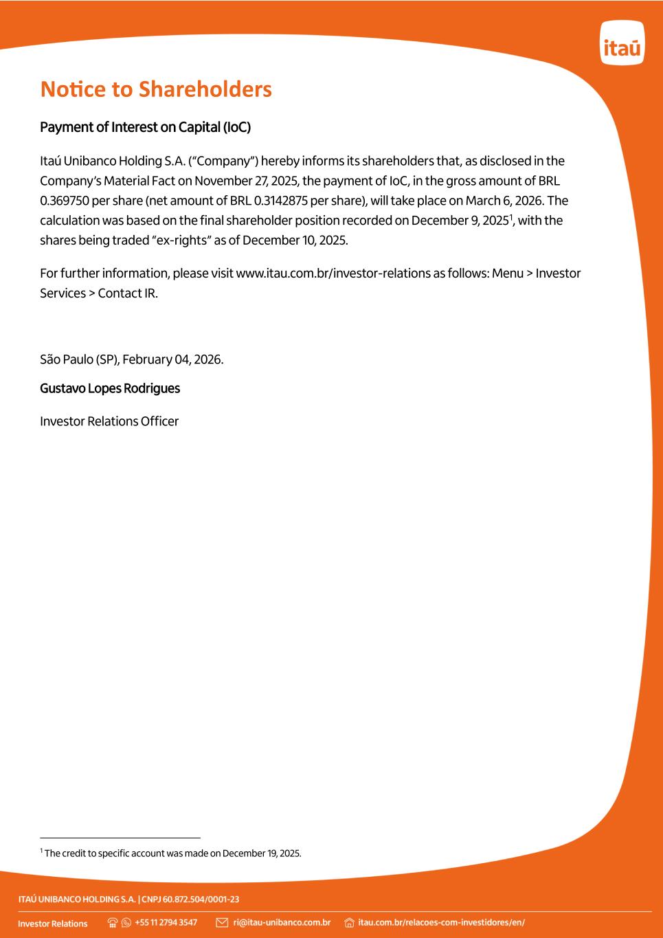 Notice to Shareholders Payment of Interest on Capital (IoC) Itaú Unibanco Holding S.A. (“Company”) hereby informs its shareholders that, as disclosed in the Company’s Material Fact on November 27, 2025, the payment of IoC, in the gross amount of BRL 0.369750 per share (net amount of BRL 0.3142875 per share), will take place on March 6, 2026. The calculation was based on the final shareholder position recorded on December 9, 20251, with the shares being traded “ex-rights” as of December 10, 2025. For further information, please visit www.itau.com.br/investor-relations as follows: Menu > Investor Services > Contact IR. São Paulo (SP), February 04, 2026. Gustavo Lopes Rodrigues Investor Relations Officer 1 The credit to specific account was made on December 19, 2025.