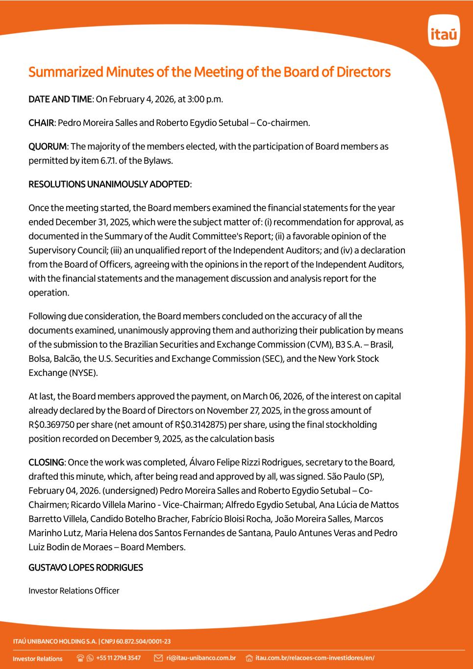 Summarized Minutes of the Meeting of the Board of Directors DATE AND TIME: On February 4, 2026, at 3:00 p.m. CHAIR: Pedro Moreira Salles and Roberto Egydio Setubal – Co-chairmen. QUORUM: The majority of the members elected, with the participation of Board members as permitted by item 6.7.1. of the Bylaws. RESOLUTIONS UNANIMOUSLY ADOPTED: Once the meeting started, the Board members examined the financial statements for the year ended December 31, 2025, which were the subject matter of: (i) recommendation for approval, as documented in the Summary of the Audit Committee's Report; (ii) a favorable opinion of the Supervisory Council; (iii) an unqualified report of the Independent Auditors; and (iv) a declaration from the Board of Officers, agreeing with the opinions in the report of the Independent Auditors, with the financial statements and the management discussion and analysis report for the operation. Following due consideration, the Board members concluded on the accuracy of all the documents examined, unanimously approving them and authorizing their publication by means of the submission to the Brazilian Securities and Exchange Commission (CVM), B3 S.A. – Brasil, Bolsa, Balcão, the U.S. Securities and Exchange Commission (SEC), and the New York Stock Exchange (NYSE). At last, the Board members approved the payment, on March 06, 2026, of the interest on capital already declared by the Board of Directors on November 27, 2025, in the gross amount of R$0.369750 per share (net amount of R$0.3142875) per share, using the final stockholding position recorded on December 9, 2025, as the calculation basis CLOSING: Once the work was completed, Álvaro Felipe Rizzi Rodrigues, secretary to the Board, drafted this minute, which, after being read and approved by all, was signed. São Paulo (SP), February 04, 2026. (undersigned) Pedro Moreira Salles and Roberto Egydio Setubal – Co- Chairmen; Ricardo Villela Marino - Vice-Chairman; Alfredo Egydio Setubal, Ana Lúcia de Mattos Barretto Villela, Candido Botelho Bracher, Fabrício Bloisi Rocha, João Moreira Salles, Marcos Marinho Lutz, Maria Helena dos Santos Fernandes de Santana, Paulo Antunes Veras and Pedro Luiz Bodin de Moraes – Board Members. GUSTAVO LOPES RODRIGUES Investor Relations Officer