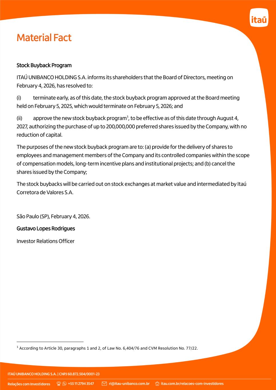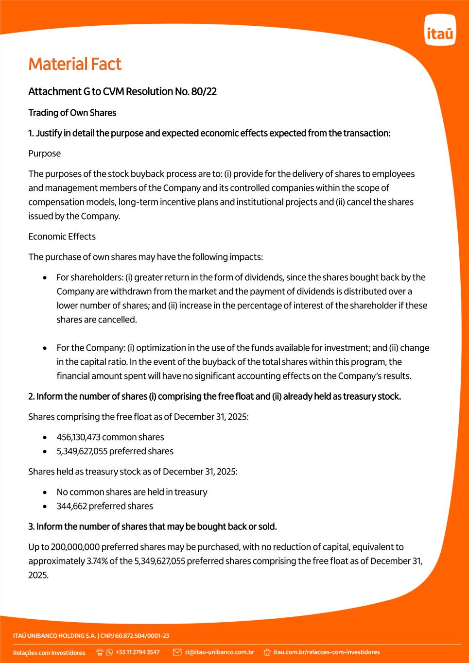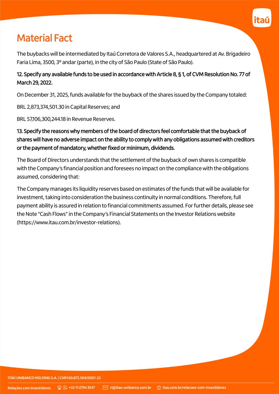 Material Fact The buybacks will be intermediated by Itaú Corretora de Valores S.A., headquartered at Av. Brigadeiro Faria Lima, 3500, 3º andar (parte), in the city of São Paulo (State of São Paulo). 12. Specify any available funds to be used in accordance with Article 8, § 1, of CVM Resolution No. 77 of March 29, 2022. On December 31, 2025, funds available for the buyback of the shares issued by the Company totaled: BRL 2,873,374,501.30 in Capital Reserves; and BRL 57,106,300,244.18 in Revenue Reserves. 13. Specify the reasons why members of the board of directors feel comfortable that the buyback of shares will have no adverse impact on the ability to comply with any obligations assumed with creditors or the payment of mandatory, whether fixed or minimum, dividends. The Board of Directors understands that the settlement of the buyback of own shares is compatible with the Company’s financial position and foresees no impact on the compliance with the obligations assumed, considering that: The Company manages its liquidity reserves based on estimates of the funds that will be available for investment, taking into consideration the business continuity in normal conditions. Therefore, full payment ability is assured in relation to financial commitments assumed. For further details, please see the Note “Cash Flows” in the Company’s Financial Statements on the Investor Relations website (https://www.itau.com.br/investor-relations).