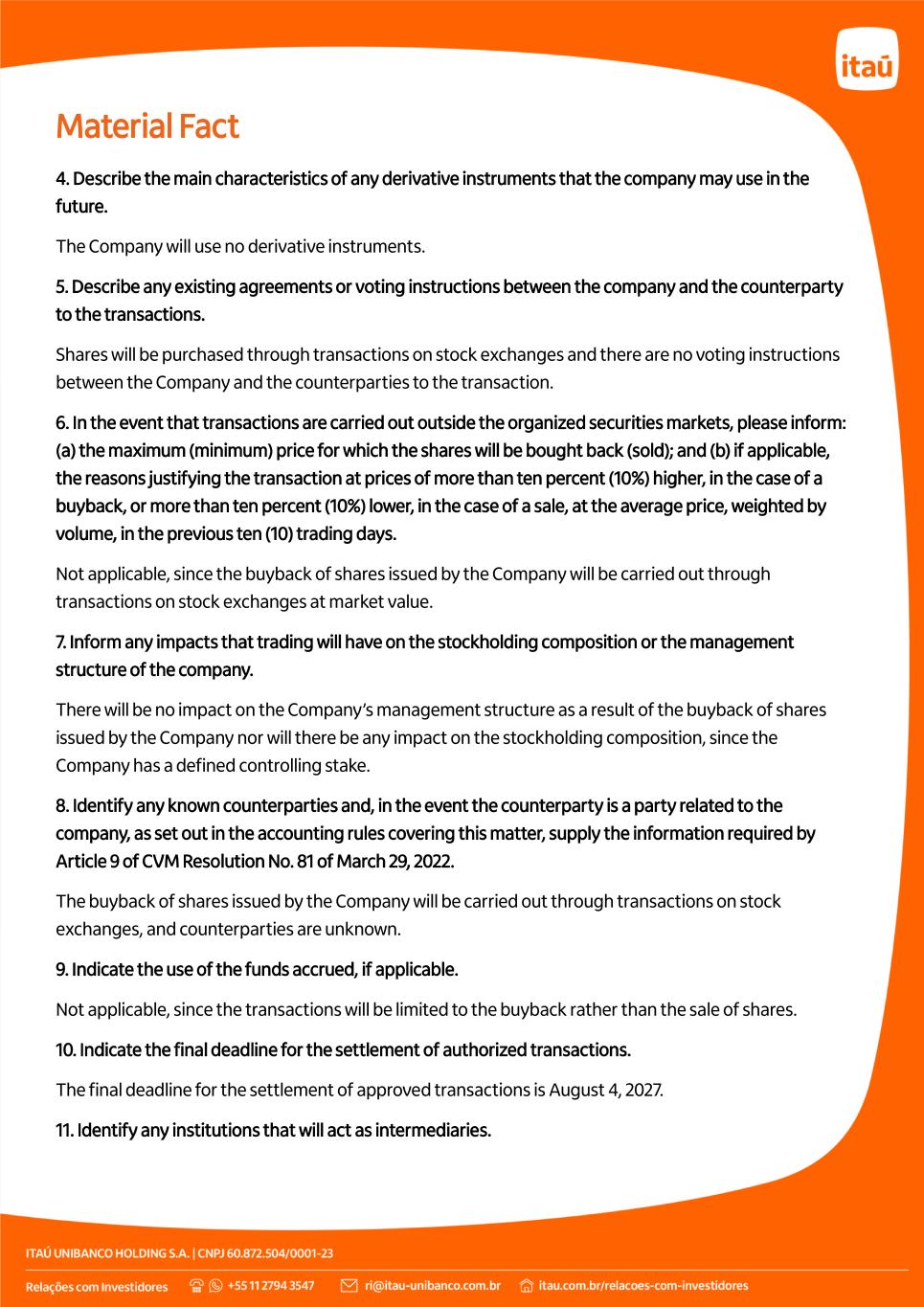 Material Fact 4. Describe the main characteristics of any derivative instruments that the company may use in the future. The Company will use no derivative instruments. 5. Describe any existing agreements or voting instructions between the company and the counterparty to the transactions. Shares will be purchased through transactions on stock exchanges and there are no voting instructions between the Company and the counterparties to the transaction. 6. In the event that transactions are carried out outside the organized securities markets, please inform: (a) the maximum (minimum) price for which the shares will be bought back (sold); and (b) if applicable, the reasons justifying the transaction at prices of more than ten percent (10%) higher, in the case of a buyback, or more than ten percent (10%) lower, in the case of a sale, at the average price, weighted by volume, in the previous ten (10) trading days. Not applicable, since the buyback of shares issued by the Company will be carried out through transactions on stock exchanges at market value. 7. Inform any impacts that trading will have on the stockholding composition or the management structure of the company. There will be no impact on the Company’s management structure as a result of the buyback of shares issued by the Company nor will there be any impact on the stockholding composition, since the Company has a defined controlling stake. 8. Identify any known counterparties and, in the event the counterparty is a party related to the company, as set out in the accounting rules covering this matter, supply the information required by Article 9 of CVM Resolution No. 81 of March 29, 2022. The buyback of shares issued by the Company will be carried out through transactions on stock exchanges, and counterparties are unknown. 9. Indicate the use of the funds accrued, if applicable. Not applicable, since the transactions will be limited to the buyback rather than the sale of shares. 10. Indicate the final deadline for the settlement of authorized transactions. The final deadline for the settlement of approved transactions is August 4, 2027. 11. Identify any institutions that will act as intermediaries.