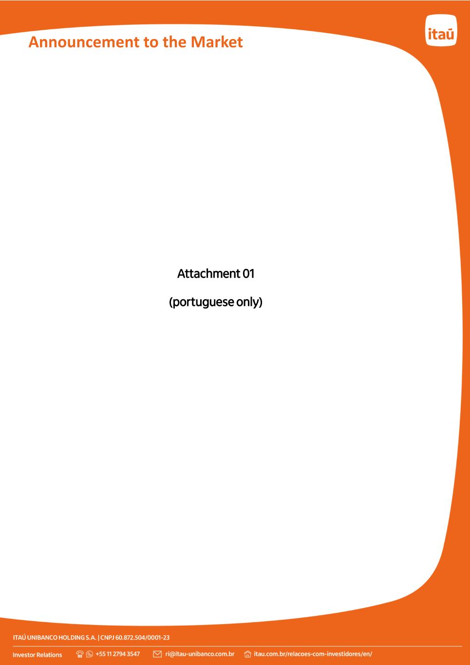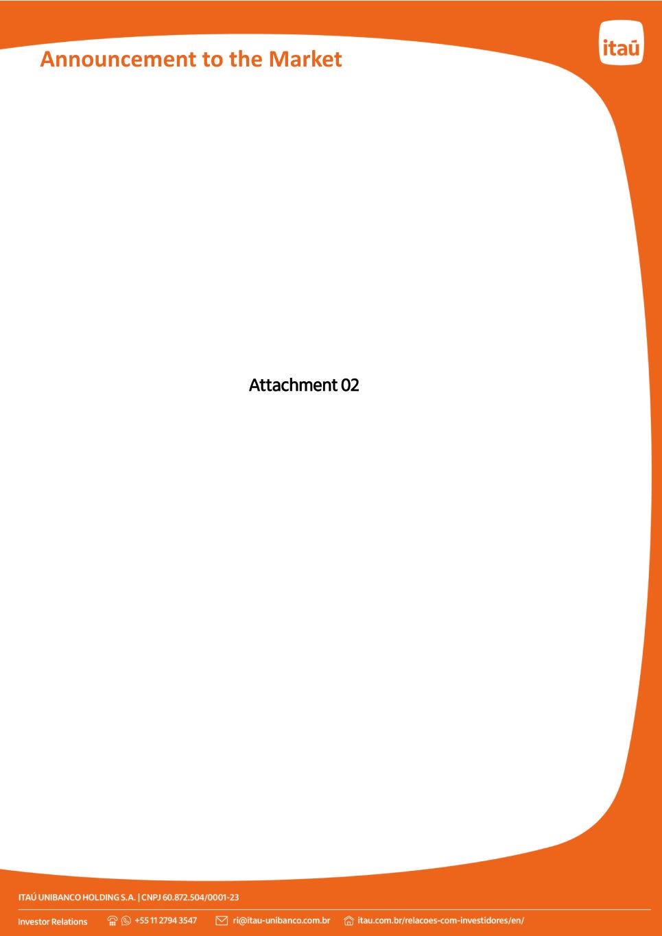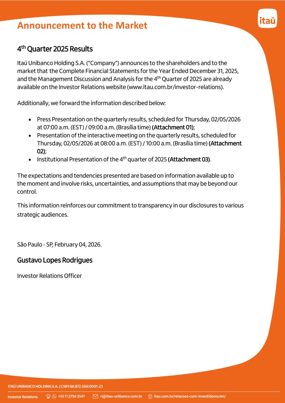 Announcement to the Market 4th Quarter 2025 Results Itaú Unibanco Holding S.A. (“Company”) announces to the shareholders and to the market that the Complete Financial Statements for the Year Ended December 31, 2025, and the Management Discussion and Analysis for the 4th Quarter of 2025 are already available on the Investor Relations website (www.itau.com.br/investor-relations). Additionally, we forward the information described below: • Press Presentation on the quarterly results, scheduled for Thursday, 02/05/2026 at 07:00 a.m. (EST) / 09:00 a.m. (Brasília time) (Attachment 01); • Presentation of the interactive meeting on the quarterly results, scheduled for Thursday, 02/05/2026 at 08:00 a.m. (EST) / 10:00 a.m. (Brasília time) (Attachment 02); • Institutional Presentation of the 4th quarter of 2025 (Attachment 03). The expectations and tendencies presented are based on information available up to the moment and involve risks, uncertainties, and assumptions that may be beyond our control. This information reinforces our commitment to transparency in our disclosures to various strategic audiences. São Paulo ‐ SP, February 04, 2026. Gustavo Lopes Rodrigues Investor Relations Officer