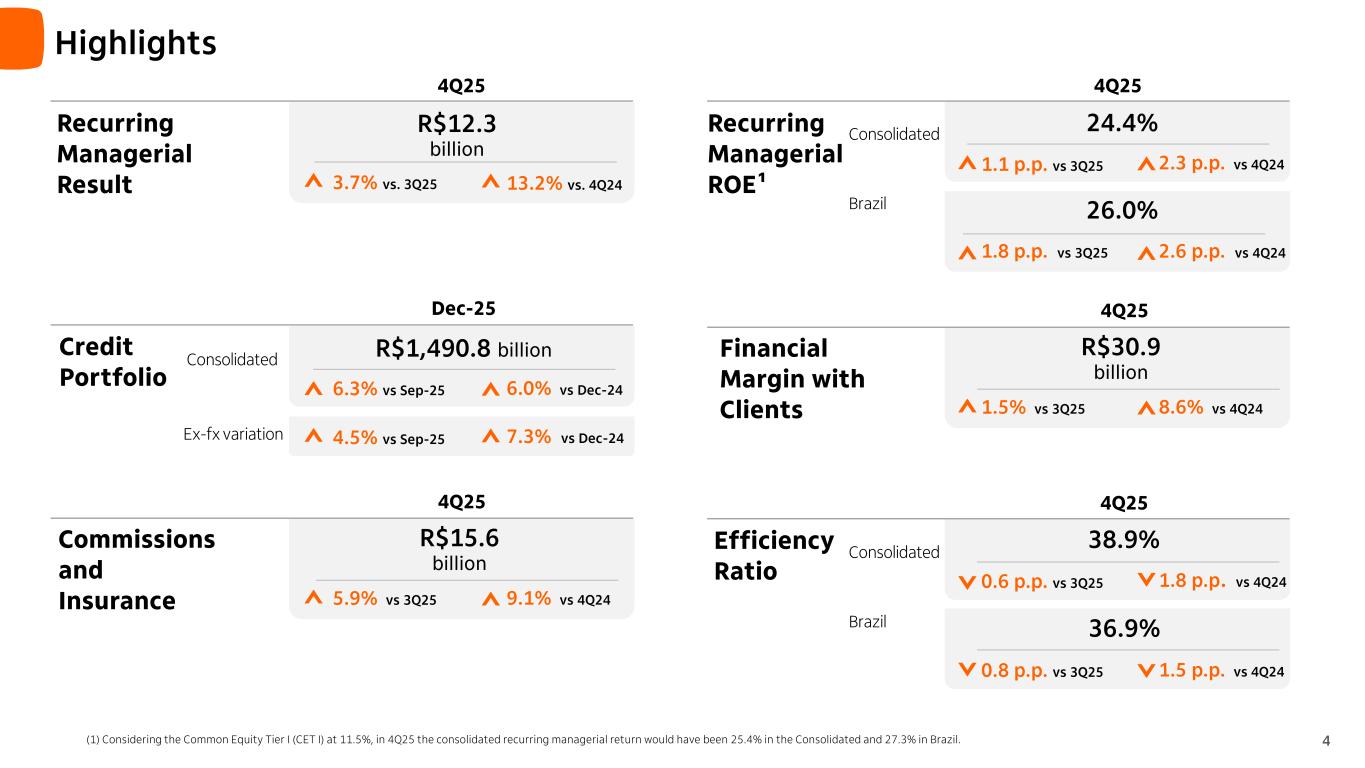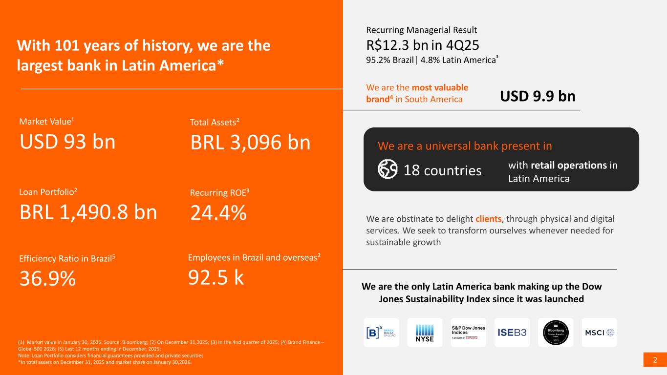With 101 years of history, we are the largest bank in Latin America* Market Value¹ USD 93 bn Total Assets² BRL 3,096 bn Loan Portfolio² BRL 1,490.8 bn Recurring ROE³ 24.4% Efficiency Ratio in Brazil5 36.9% Employees in Brazil and overseas² 92.5 k We are the only Latin America bank making up the Dow Jones Sustainability Index since it was launched We are the most valuable brand4 in South America Recurring Managerial Result R$12.3 bn in 4Q25 95.2% Brazil| 4.8% Latin America³ USD 9.9 bn (1) Market value in January 30, 2026. Source: Bloomberg; (2) On December 31,2025; (3) In the 4nd quarter of 2025; (4) Brand Finance – Global 500 2026; (5) Last 12 months ending in December, 2025; Note: Loan Portfolio considers financial guarantees provided and private securities *In total assets on December 31, 2025 and market share on January 30,2026. We are obstinate to delight clients, through physical and digital services. We seek to transform ourselves whenever needed for sustainable growth We are a universal bank present in 18 countries with retail operations in Latin America 2