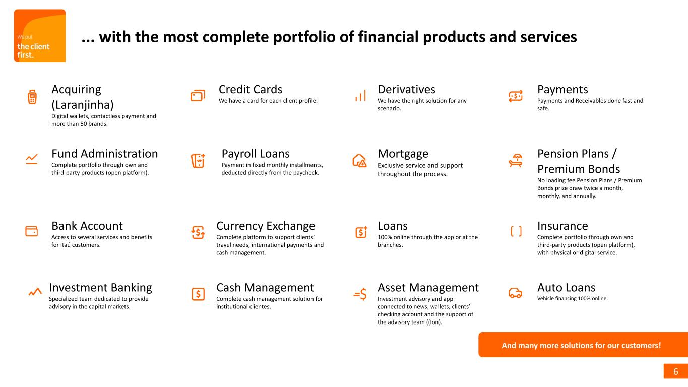 6 Acquiring (Laranjinha) Digital wallets, contactless payment and more than 50 brands. Loans 100% online through the app or at the branches. Mortgage Exclusive service and support throughout the process. And many more solutions for our customers! ... with the most complete portfolio of financial products and services Payments Payments and Receivables done fast and safe. A gente trabalha para o cliente Auto Loans Vehicle financing 100% online. Insurance Complete portfolio through own and third-party products (open platform), with physical or digital service. Pension Plans / Premium Bonds No loading fee Pension Plans / Premium Bonds prize draw twice a month, monthly, and annually. Asset Management Investment advisory and app connected to news, wallets, clients’ checking account and the support of the advisory team ((Ion). Investment Banking Specialized team dedicated to provide advisory in the capital markets. Derivatives We have the right solution for any scenario. Cash Management Complete cash management solution for institutional clientes. Currency Exchange Complete platform to support clients’ travel needs, international payments and cash management. Payroll Loans Payment in fixed monthly installments, deducted directly from the paycheck. Credit Cards We have a card for each client profile. Bank Account Access to several services and benefits for Itaú customers. Fund Administration Complete portfolio through own and third-party products (open platform).