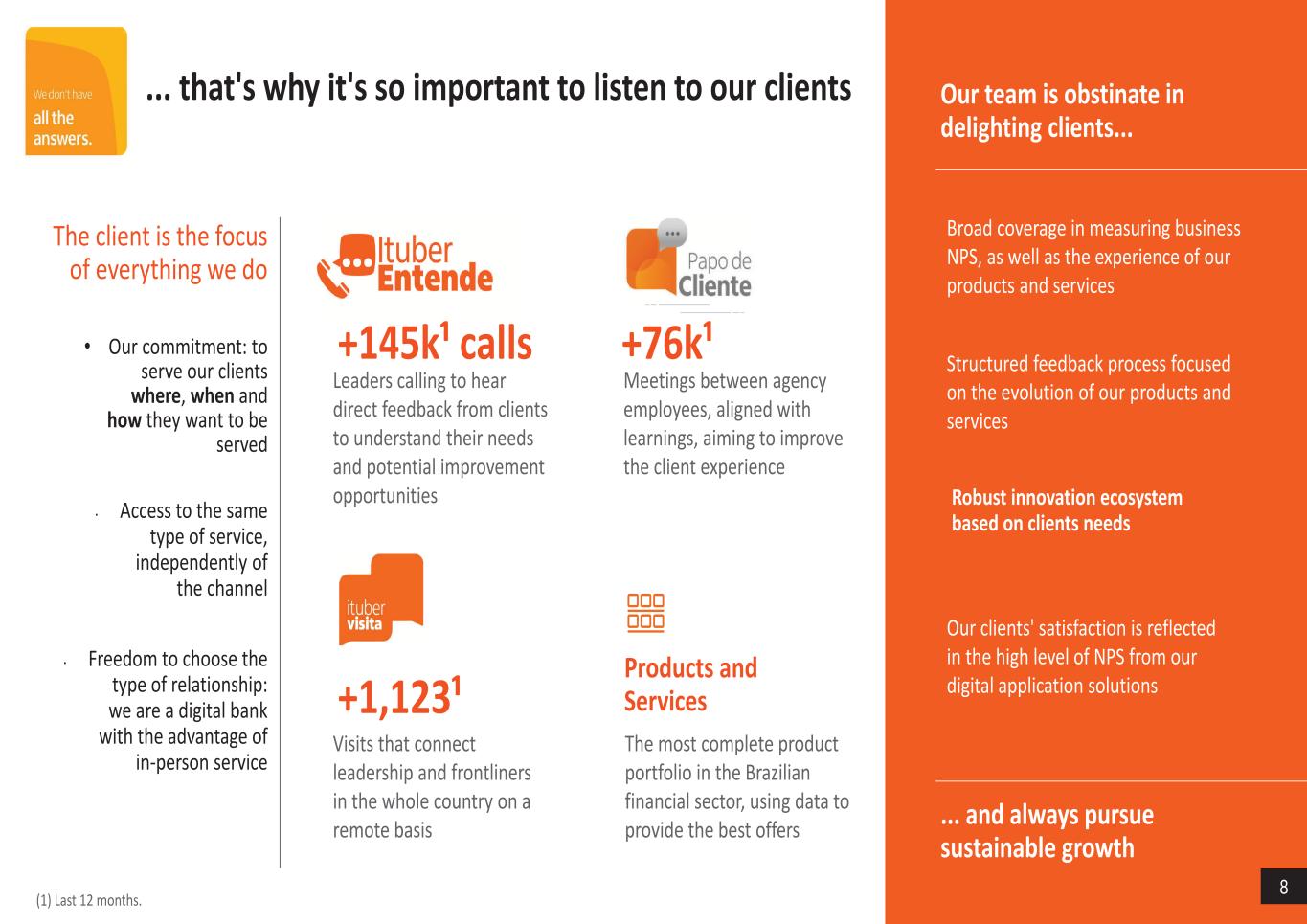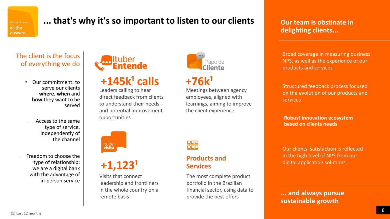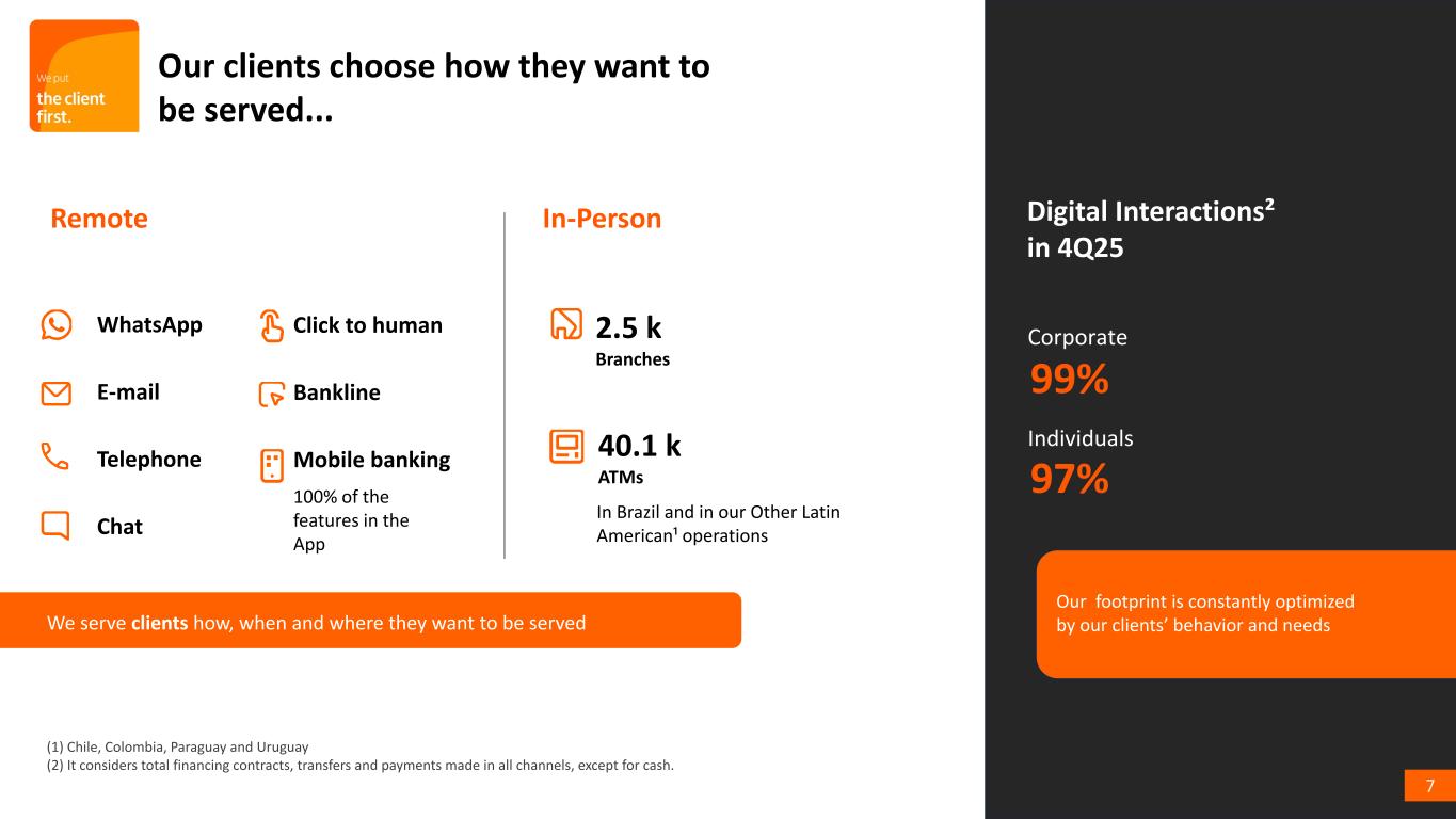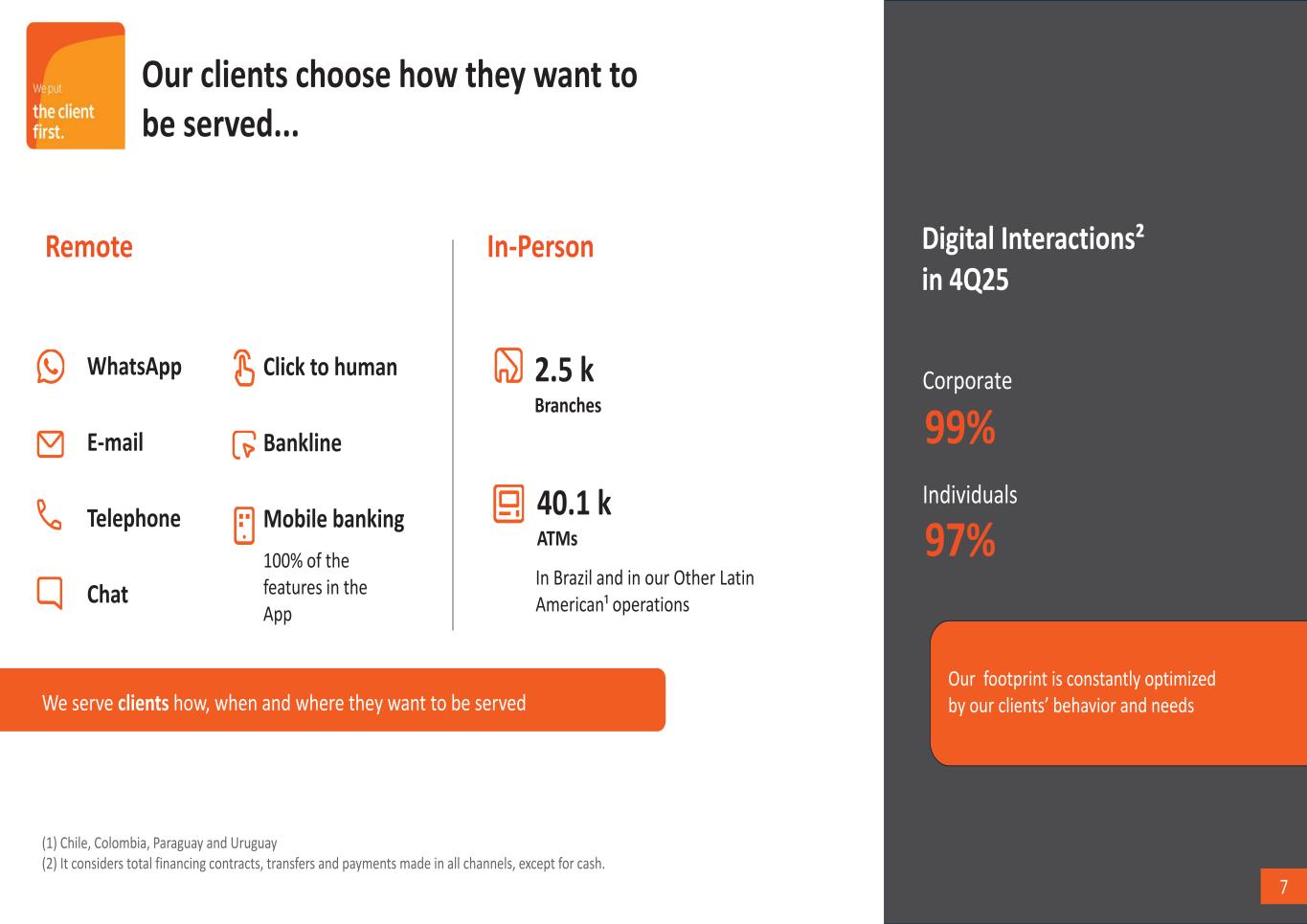 We serve clients how, when and where they want to be served 2.5 k Branches In-Person 40.1 k ATMs In Brazil and in our Other Latin American¹ operations WhatsApp E-mail Telephone Chat Click to human Bankline Mobile banking 100% of the features in the App Our footprint is constantly optimized by our clients’ behavior and needs Digital Interactions² in 4Q25 Corporate Remote Our clients choose how they want to be served... Individuals 97% (1) Chile, Colombia, Paraguay and Uruguay (2) It considers total financing contracts, transfers and payments made in all channels, except for cash. 99% 7