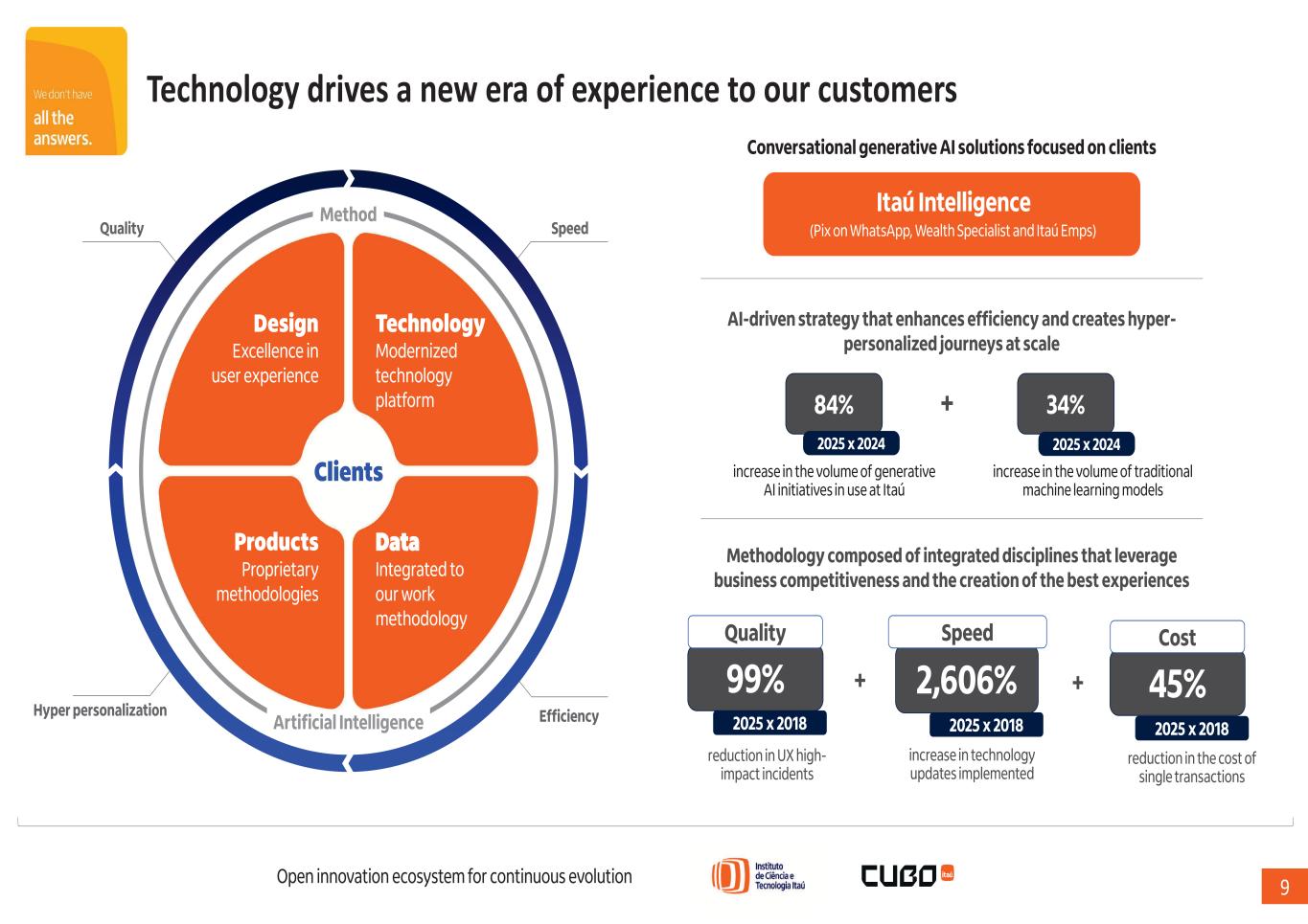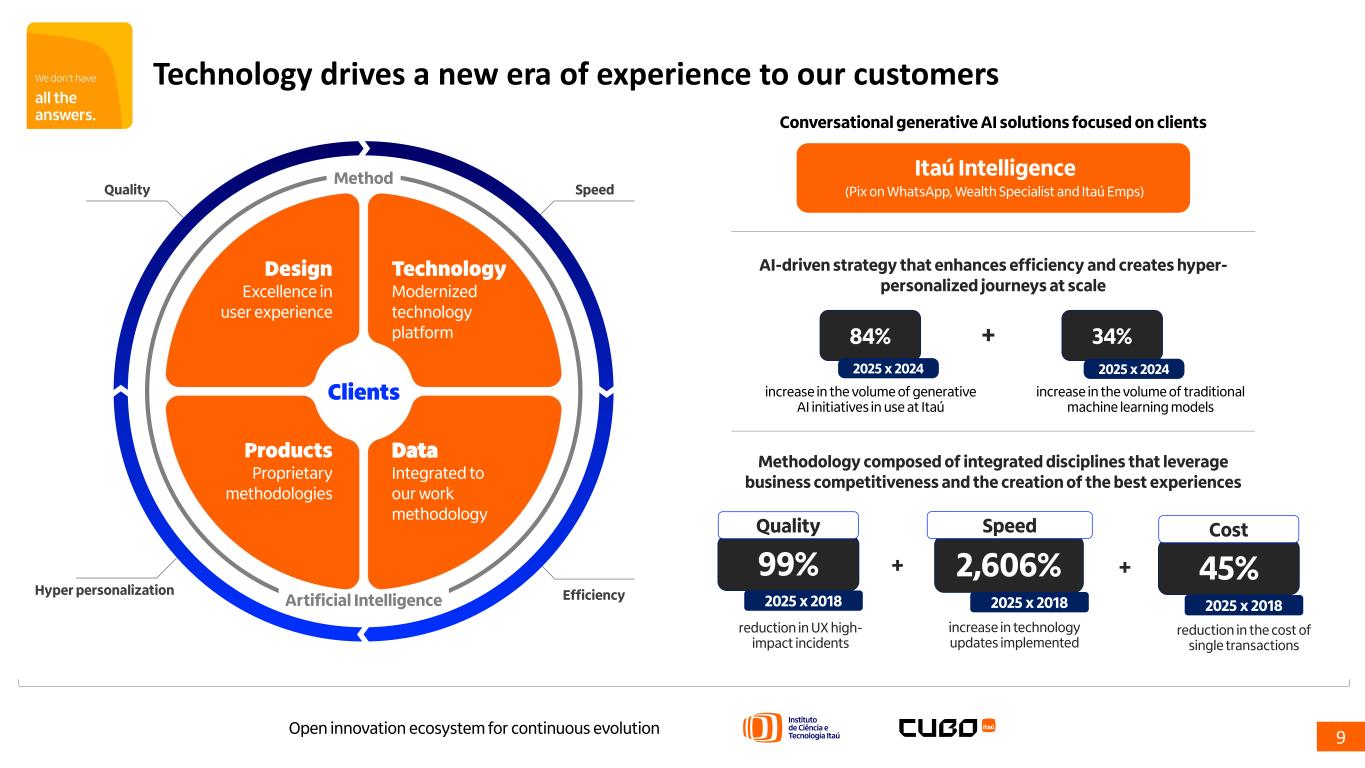 99% Quality 2025 x 2018 increase in technology updates implemented reduction in UX high- impact incidents reduction in the cost of single transactions 2,606% Speed 2025 x 2018 45% Cost 2025 x 2018 Quality Method Artificial Intelligence Hyper personalization Efficiency Speed Design Excellence in user experience Data Integrated to our work methodology Products Proprietary methodologies Technology Modernized technology platform Clients + + AI-driven strategy that enhances efficiency and creates hyper- personalized journeys at scale 84% increase in the volume of generative AI initiatives in use at Itaú + increase in the volume of traditional machine learning models 34% Conversational generative AI solutions focused on clients (Pix on WhatsApp, Wealth Specialist and Itaú Emps) Itaú Intelligence 2025 x 2024 2025 x 2024 Open innovation ecosystem for continuous evolution Methodology composed of integrated disciplines that leverage business competitiveness and the creation of the best experiences