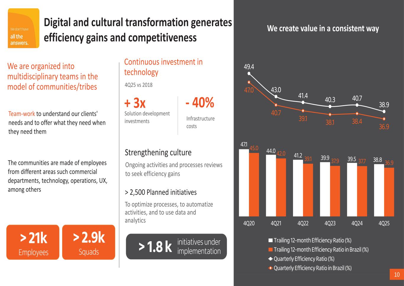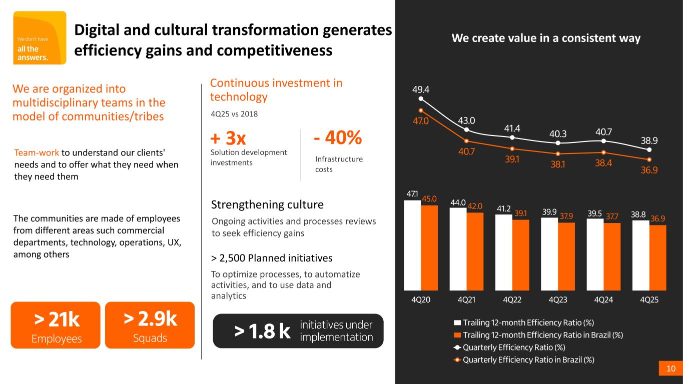 9 Technology drives a new era of experience to our customers 99% Quality 2025 x 2018 increase in technology updates implemented reduction in UX high- impact incidents reduction in the cost of single transactions 2,606% Speed 2025 x 2018 45% Cost 2025 x 2018 Quality Method Artificial Intelligence Hyper personalization Efficiency Speed Design Excellence in user experience Data Integrated to our work methodology Products Proprietary methodologies Technology Modernized technology platform Clients + + AI-driven strategy that enhances efficiency and creates hyper- personalized journeys at scale 84% increase in the volume of generative AI initiatives in use at Itaú + increase in the volume of traditional machine learning models 34% Conversational generative AI solutions focused on clients (Pix on WhatsApp, Wealth Specialist and Itaú Emps) Itaú Intelligence 2025 x 2024 2025 x 2024 Open innovation ecosystem for continuous evolution Methodology composed of integrated disciplines that leverage business competitiveness and the creation of the best experiences