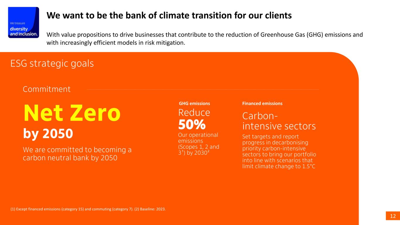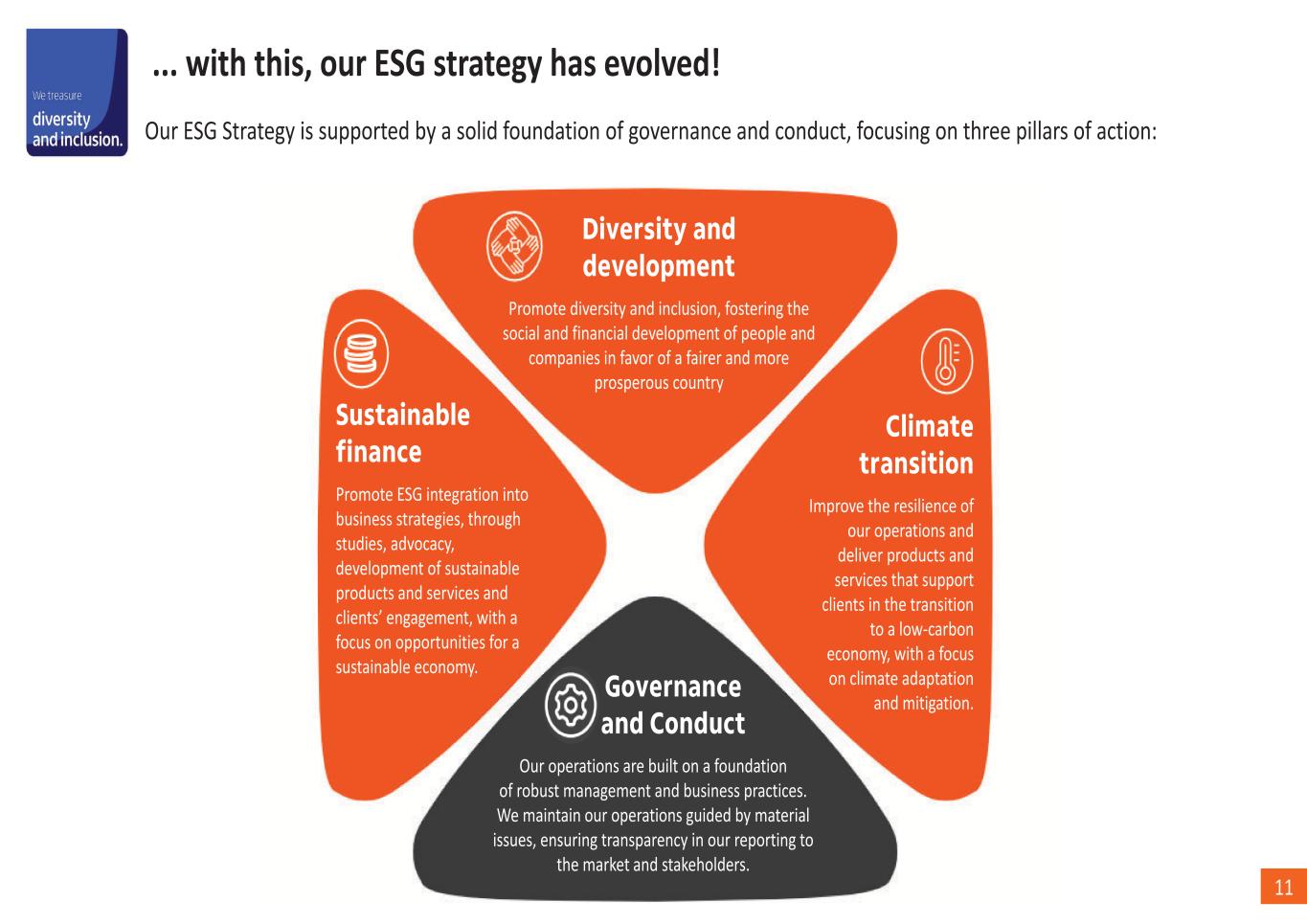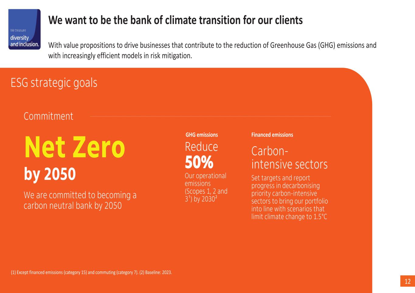 11 ... with this, our ESG strategy has evolved! Our ESG Strategy is supported by a solid foundation of governance and conduct, focusing on three pillars of action: Climate transition Improve the resilience of our operations and deliver products and services that support clients in the transition to a low-carbon economy, with a focus on climate adaptation and mitigation. Sustainable finance Promote ESG integration into business strategies, through studies, advocacy, development of sustainable products and services and clients’ engagement, with a focus on opportunities for a sustainable economy. Diversity and development Promote diversity and inclusion, fostering the social and financial development of people and companies in favor of a fairer and more prosperous country Governance and Conduct Our operations are built on a foundation of robust management and business practices. We maintain our operations guided by material issues, ensuring transparency in our reporting to the market and stakeholders.