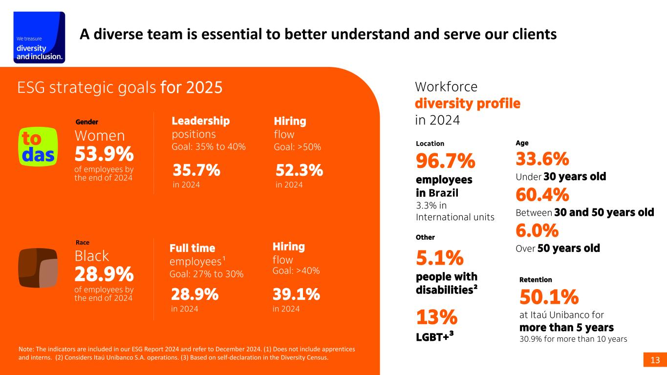 Women 53.9% of employees by the end of 2024 Black 28.9% of employees by the end of 2024 Leadership positions Goal: 35% to 40% Location 96.7% employees in Brazil 3.3% in International units Hiring flow Goal: >50% Full time employees¹ Goal: 27% to 30% Hiring flow Goal: >40% ESG strategic goals for 2025 35.7% in 2024 52.3% in 2024 28.9% in 2024 39.1% in 2024 Workforce diversity profile in 2024 Other 5.1% people with disabilities² 13% LGBT+³ Gender Age 33.6% Under 30 years old 60.4% Between 30 and 50 years old 6.0% Over 50 years old Retention 50.1% at Itaú Unibanco for more than 5 years 30.9% for more than 10 years