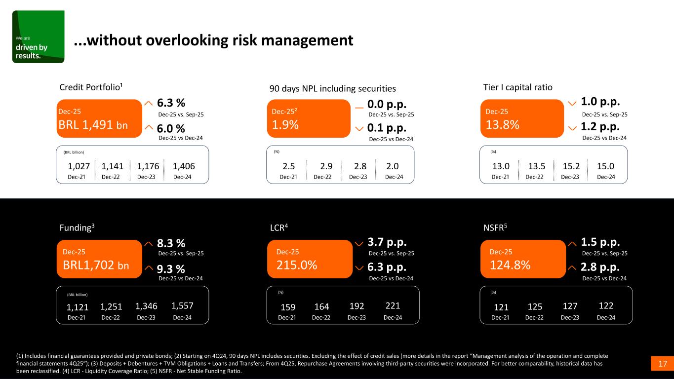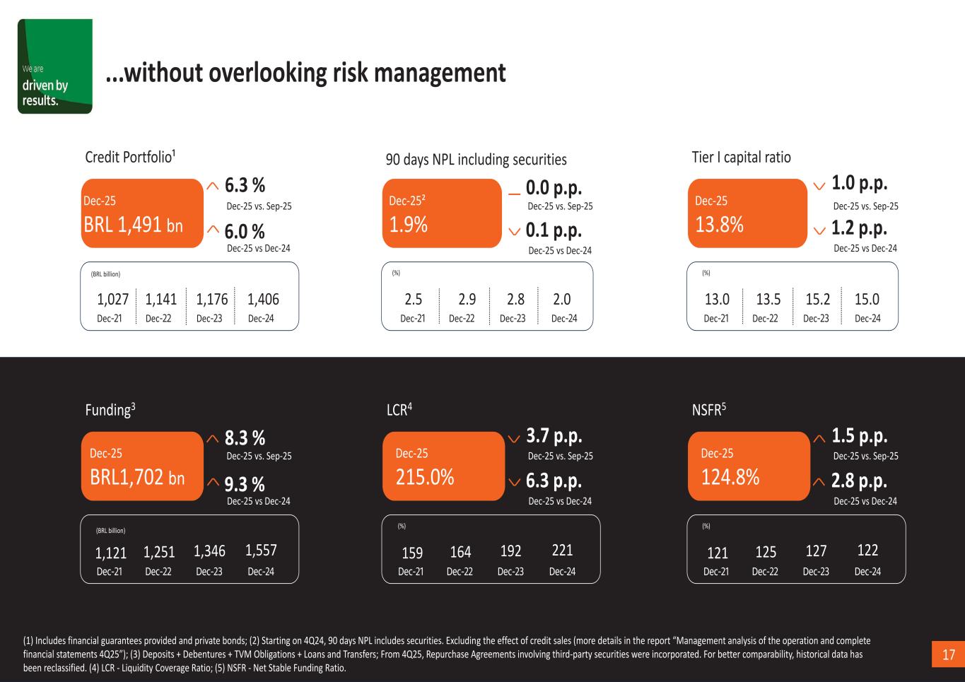16 4Q25 BRL30.9 bn Clients NII 1.5% 4Q25 vs. 3Q25 (BRL billion) 8.6% 4Q25 vs. 4Q24 We have been presenting higher revenue with a cost discipline... 19.9 24.2 26.3 28.5 4Q21 4Q22 4Q23 4Q24 4Q25 BRL15.6 bn Commissions and insurance 5.9% 4Q25 vs. 3Q25 (BRL billion) 9.1% 4Q25 vs. 4Q24 4Q25 BRL17.3 bn Non-interest expenses 1.0% 4Q25 vs. 3Q25 (BRL billion) 3.7% 4Q25 vs. 4Q24 4Q25 BRL12.3 bn Recurring managerial result 3.7% 4Q25 vs. 3Q25 (BRL billion) 13.2% 4Q25 vs. 4Q24 4Q25 BRL0.6 bn Market NII 33.9% 4Q25 vs. 3Q25 (BRL billion) 34.0% 4Q25 vs. 4Q24 4Q25 BRL9.4 bn Cost of Credit 2.8% 4Q25 vs. 3Q25 (BRL billion) 8.7% 4Q25 vs. 4Q24 1.3 0.7 0.8 0.9 4Q21 4Q22 4Q23 4Q24 6.2 9.8 9.2 8.6 4Q21 4Q22 4Q23 4Q24 11.9 12.5 13.5 14.3 4Q21 4Q22 4Q23 4Q24 13.4 14.6 15.3 16.7 4Q21 4Q22 4Q23 4Q24 7.2 7.7 9.4 10.9 4Q21 4Q22 4Q23 4Q24 Note: The 2025 results consider the application of Resolution 4,966.