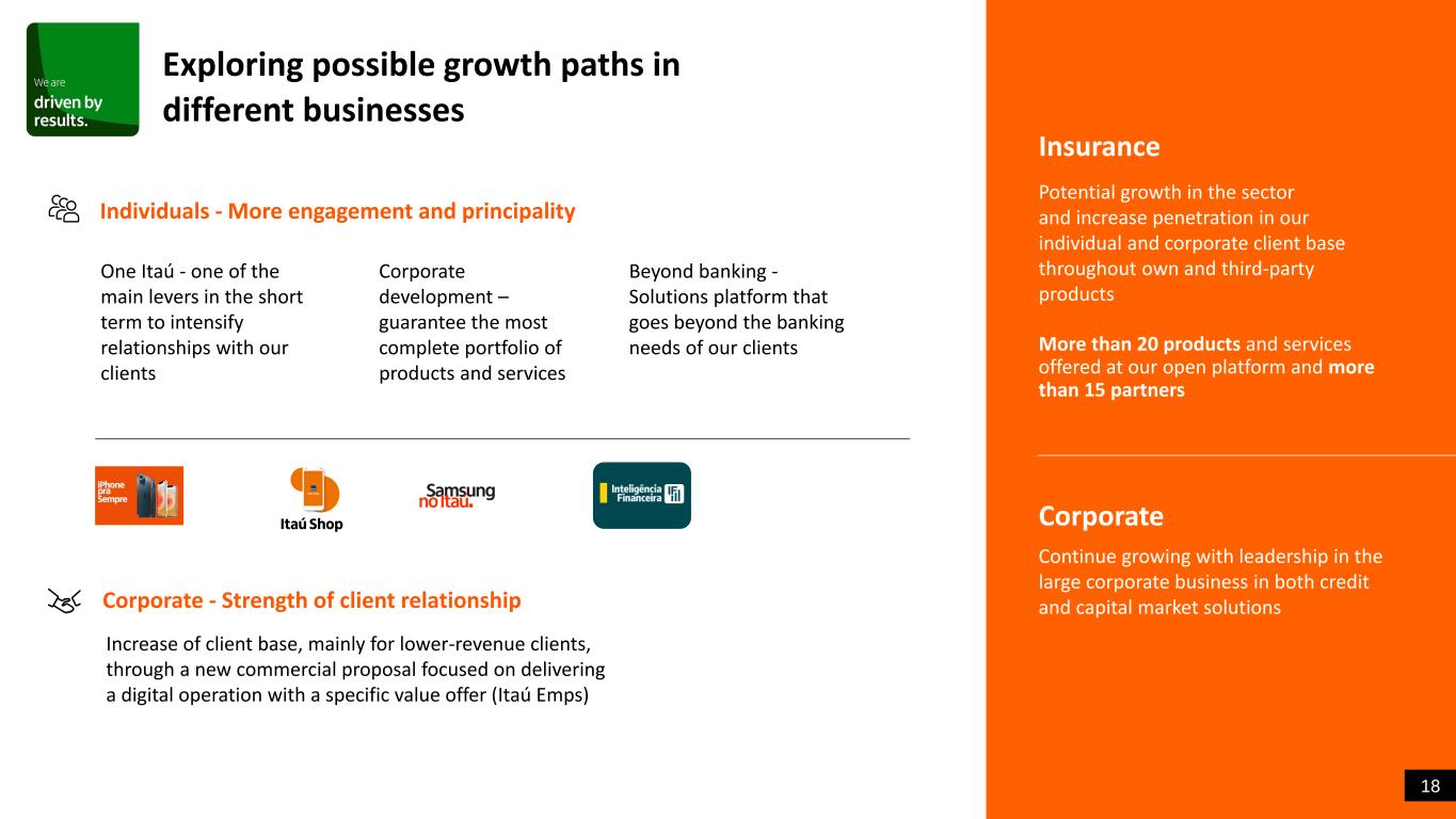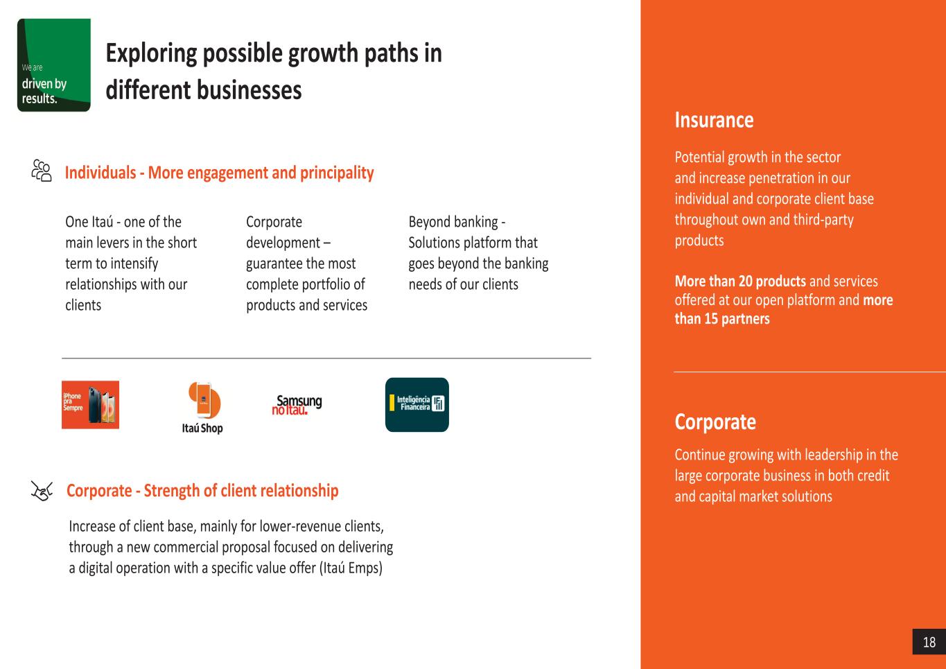 18 One Itaú - one of the main levers in the short term to intensify relationships with our clients Individuals - More engagement and principality Insurance More than 20 products and services offered at our open platform and more than 15 partners Potential growth in the sector and increase penetration in our individual and corporate client base throughout own and third-party products Continue growing with leadership in the large corporate business in both credit and capital market solutions CorporateItaú Shop Exploring possible growth paths in different businesses Corporate development – guarantee the most complete portfolio of products and services Beyond banking - Solutions platform that goes beyond the banking needs of our clients Corporate - Strength of client relationship Increase of client base, mainly for lower-revenue clients, through a new commercial proposal focused on delivering a digital operation with a specific value offer (Itaú Emps)