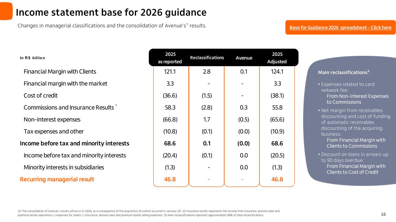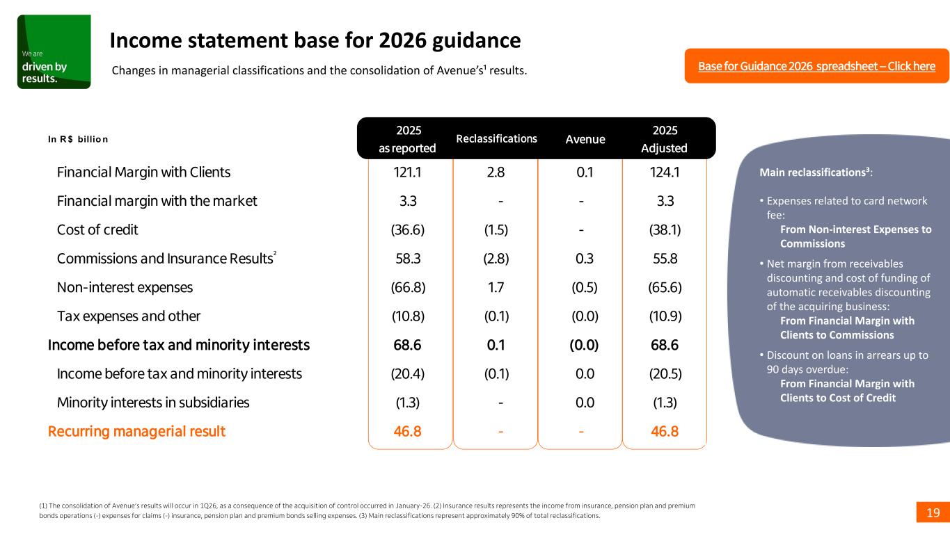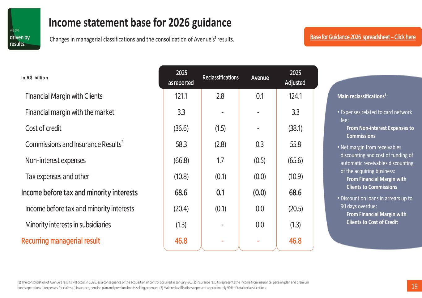 (1) The consolidation of Avenue’s results will occur in 1Q26, as a consequence of the acquisition of control occurred in January-26. (2) Insurance results represents the income from insurance, pension plan and premium bonds operations (-) expenses for claims (-) insurance, pension plan and premium bonds selling expenses. (3) Main reclassifications represent approximately 90% of total reclassifications. 2 • • • In R $ billio n 2025 as reported Reclassifications Avenue 2025 Adjusted Financial Margin with Clients 121.1 2.8 0.1 124.1 Financial margin with the market 3.3 - - 3.3 Cost of credit (36.6) (1.5) - (38.1) Commissions and Insurance Results 58.3 (2.8) 0.3 55.8 Non-interest expenses (66.8) 1.7 (0.5) (65.6) Tax expenses and other (10.8) (0.1) (0.0) (10.9) Income before tax and minority interests 68.6 0.1 (0.0) 68.6 Income before tax and minority interests (20.4) (0.1) 0.0 (20.5) Minority interests in subsidiaries (1.3) - 0.0 (1.3) Recurring managerial result 46.8 - - 46.8 Base for Guidance 2026 spreadsheet – Click here
