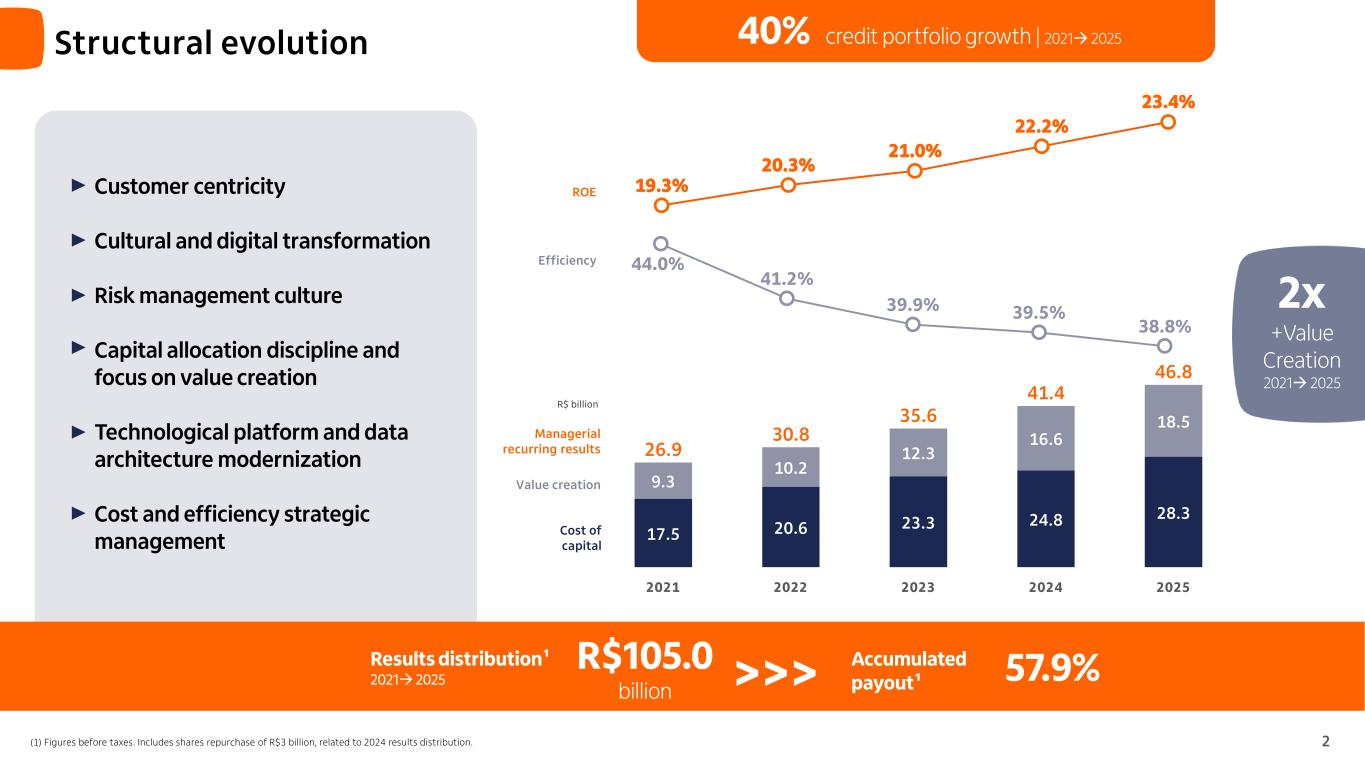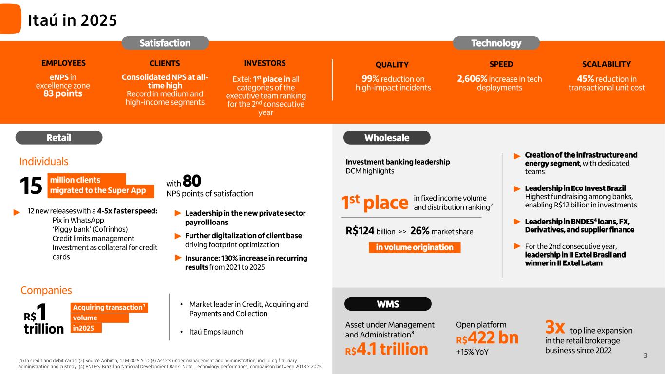2 19.3% 20.3% 21.0% 22.2% 23.4% 44.0% 41.2% 39.9% 39.5% 38.8% 17.5 20.6 23.3 24.8 28.3 9.3 10.2 12.3 16.6 18.5 26.9 30.8 35.6 41.4 46.8 2021 2022 2023 2024 2025 Structural evolution ROE Efficiency R$ billion (1) Figures before taxes. Includes shares repurchase of R$3 billion, related to 2024 results distribution. 2x +Value Creation 2021→ 2025 Managerial recurring results Value creation Cost of capital Results distribution¹ 2021→ 2025 >>> Accumulated payout¹ 57.9%R$105.0 billion 40% credit portfolio growth | 2021→ 2025 Customer centricity Cultural and digital transformation Risk management culture Capital allocation discipline and focus on value creation Technological platform and data architecture modernization Cost and efficiency strategic management
