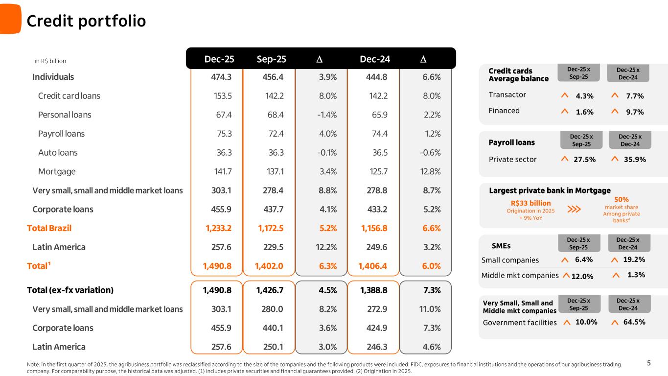 4(1) Considering the Common Equity Tier I (CET I) at 11.5%, in 4Q25 the consolidated recurring managerial return would have been 25.4% in the Consolidated and 27.3% in Brazil. 24.4% Credit Portfolio Recurring Managerial Result R$12.3 billion 3.7% vs. 3Q25 Dec-25 Recurring Managerial ROE¹ Efficiency Ratio 4Q25 4Q25 26.0%Brazil Consolidated 1.1 p.p. vs 3Q25 1.8 p.p. vs 3Q25 4Q25 13.2% vs. 4Q24 2.3 p.p. vs 4Q24 2.6 p.p. vs 4Q24 Financial Margin with Clients 4Q25 1.5% vs 3Q25 8.6% vs 4Q24 Highlights R$30.9 billion 38.9% 36.9%Brazil Consolidated 0.6 p.p. vs 3Q25 0.8 p.p. vs 3Q25 1.8 p.p. vs 4Q24 1.5 p.p. vs 4Q24 R$1,490.8 billion Ex-fx variation Consolidated 6.3% vs Sep-25 4.5% vs Sep-25 6.0% vs Dec-24 7.3% vs Dec-24 Commissions and Insurance 5.9% vs 3Q25 9.1% vs 4Q24 R$15.6 billion 4Q25