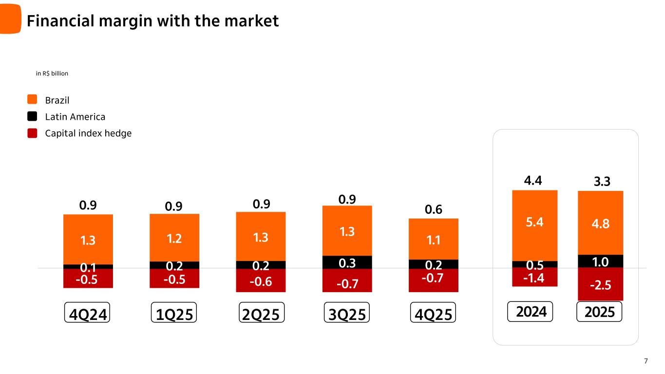 6 Annualized average margin Brazil Annualized average margin consolidated Financial margin with clients ¹ 2 ¹ 3 R$0.5 bn (+1.5%) R$13.1 bn (+12.1%) 2025 x 2024 in R$ billion Margin with clients Risk-adjusted margin with clients (1) Includes capital allocated to the business areas (except treasury), in addition to working capital of the corporation; (2) Change in the composition of assets with credit risk between periods in Brazil; (3) Latin America and structured wholesale operations and acquiring financial margin. 30.5 26.6 ​ 27.0 30.9 -3.9 -0.3 -0.1 -0.04 ​ 0.5 0.3 4.0 3Q25 Working capital and others 3Q25 Spread-sensitive operations 3Q25 Average Volume Product Mix Spreads and liabilities' margin Calendar and working days Latin America and others Spread-sensitive operations 4Q25 Working capital and others 4Q25 4Q25 9.3% 9.8% 10.0% 9.8% 9.7% 6.3% 6.6% 6.9% 6.7% 6.6% 4Q24 1Q25 2Q25 3Q25 4Q25 8.6% 9.0% 9.2% 9.0% 8.9% 5.9% 6.1% 6.3% 6.2% 6.1% 4Q24 1Q25 2Q25 3Q25 4Q25