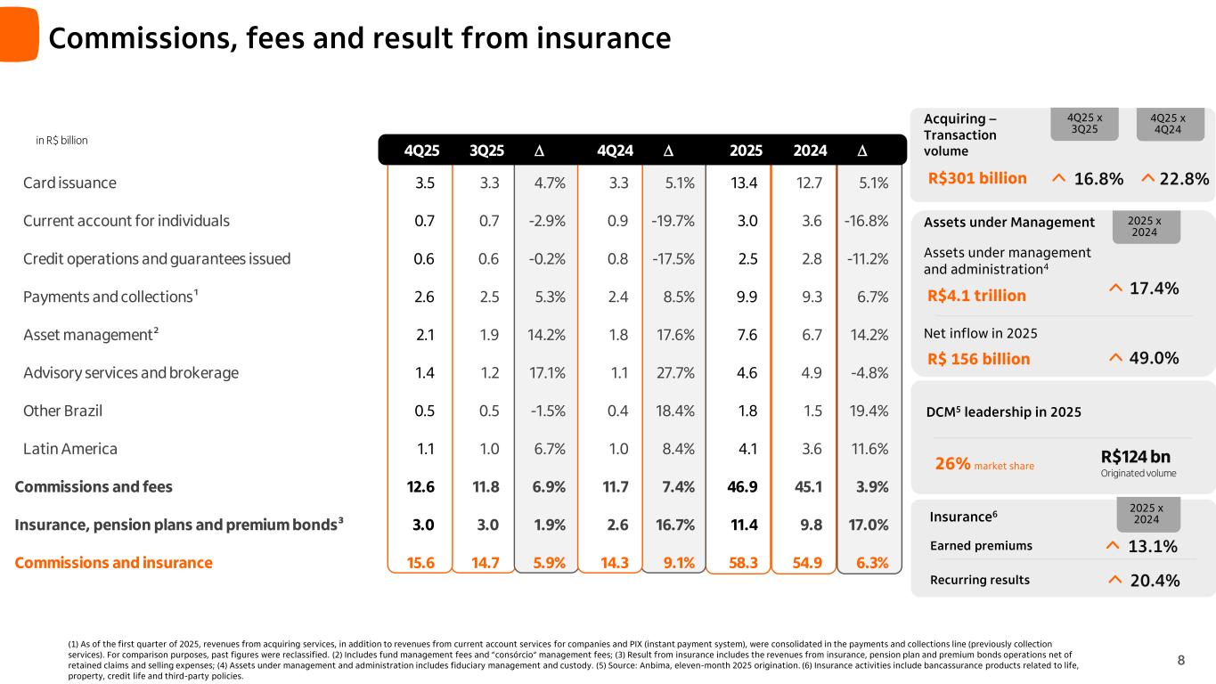 8 ‘ Commissions, fees and result from insurance Assets under Management 2025 x 2024 49.0%R$ 156 billion 26% market share DCM5 leadership in 2025 R$124 bn Originated volume Acquiring – Transaction volume 4Q25 x 3Q25 4Q25 x 4Q24 22.8%16.8%R$301 billion Net inflow in 2025 R$4.1 trillion Assets under management and administration4 17.4% in R$ billion (1) As of the first quarter of 2025, revenues from acquiring services, in addition to revenues from current account services for companies and PIX (instant payment system), were consolidated in the payments and collections line (previously collection services). For comparison purposes, past figures were reclassified. (2) Includes fund management fees and “consórcio” management fees; (3) Result from insurance includes the revenues from insurance, pension plan and premium bonds operations net of retained claims and selling expenses; (4) Assets under management and administration includes fiduciary management and custody. (5) Source: Anbima, eleven-month 2025 origination. (6) Insurance activities include bancassurance products related to life, property, credit life and third-party policies. 4Q25 3Q25 D 4Q24 D 2025 2024 D Card issuance 3.5 3.3 4.7% 3.3 5.1% 13.4 12.7 5.1% Current account for individuals 0.7 0.7 -2.9% 0.9 -19.7% 3.0 3.6 -16.8% Credit operations and guarantees issued 0.6 0.6 -0.2% 0.8 -17.5% 2.5 2.8 -11.2% Payments and collections¹ 2.6 2.5 5.3% 2.4 8.5% 9.9 9.3 6.7% Asset management² 2.1 1.9 14.2% 1.8 17.6% 7.6 6.7 14.2% Advisory services and brokerage 1.4 1.2 17.1% 1.1 27.7% 4.6 4.9 -4.8% Other Brazil 0.5 0.5 -1.5% 0.4 18.4% 1.8 1.5 19.4% Latin America 1.1 1.0 6.7% 1.0 8.4% 4.1 3.6 11.6% Commissions and fees 12.6 11.8 6.9% 11.7 7.4% 46.9 45.1 3.9% Insurance, pension plans and premium bonds³ 3.0 3.0 1.9% 2.6 16.7% 11.4 9.8 17.0% Commissions and insurance 15.6 14.7 5.9% 14.3 9.1% 58.3 54.9 6.3% Insurance6 2025 x 2024 13.1%Earned premiums 20.4%Recurring results
