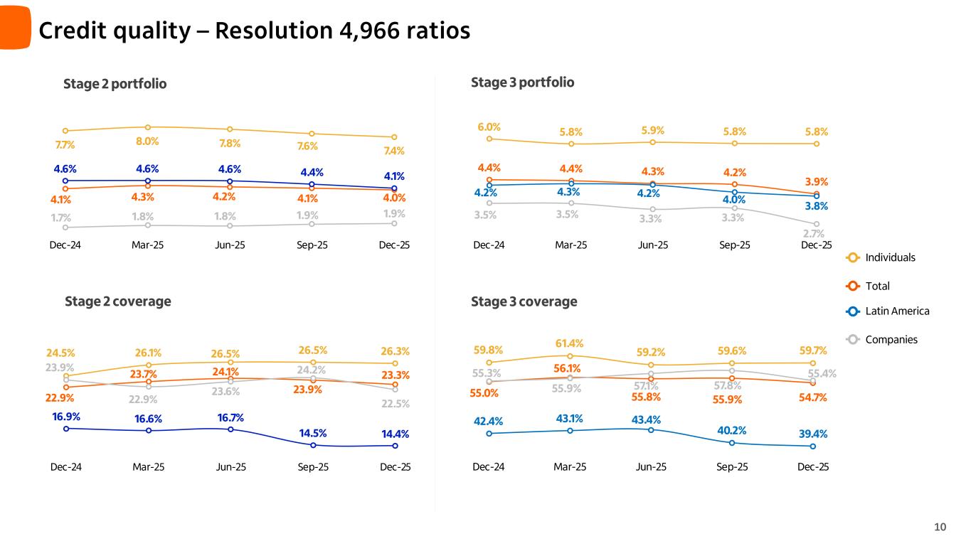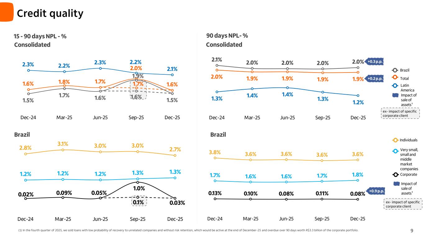 9 2.0% 1.9% 1.9% 1.9% 1.9% 2.1% 2.0% 2.0% 2.0% 2.0% 1.3% 1.4% 1.4% 1.3% 1.2% Dec-24 Mar-25 Jun-25 Sep-25 Dec-25 1.6% 1.8% 1.7% 2.0% 1.6% 1.5% 1.7% 1.6% 1.9% 1.5% 2.3% 2.2% 2.3% 2.2% 2.1% 1.7% 1.6% Dec-24 Mar-25 Jun-25 Sep-25 Dec-25 3.8% 3.6% 3.6% 3.6% 3.6% 1.7% 1.6% 1.6% 1.7% 1.8% 0.13% 0.10% 0.08% 0.11% 0.08% Dec-24 Mar-25 Jun-25 Sep-25 Dec-25 15 - 90 days NPL - % Consolidated +0.9 p.p. Credit quality 90 days NPL- % Brazil Consolidated Brazil (1) No quarto trimestre de 2025, realizamos vendas de créditos com baixa probabilidade de recuperação para empresas não ligadas e sem retenção de riscos, que estariam ativos ao final de dezembro/25 e em atraso acima de 90 dias no valor de R$ 3,3 bilhões do segmento de grandes empresas. 2.8% 3.1% 3.0% 3.0% 2.7% 1.2% 1.2% 1.2% 1.3% 1.3% 0.02% 0.09% 0.05% 1.0% 0.03%0.1% Dec-24 Mar-25 Jun-25 Sep-25 Dec-25 Impact of sale of assets¹ ex- impact of specific corporate client ex- impact of specific corporate client +0.3 p.p. Impact of sale of assets¹ +0.2 p.p. Brazil Total Latin America Individuals Very small, small and middle market companies Corporate (1) In the fourth quarter of 2025, we sold loans with low probability of recovery to unrelated companies and without risk retention, which would be active at the end of December-25 and overdue over 90 days worth R$3.3 billion of the corporate portfolio.