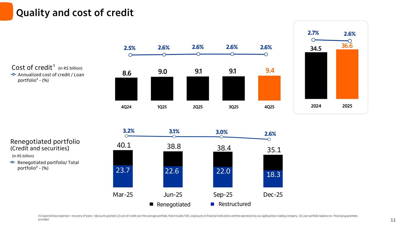> 1.8 k initiatives under implementation 10 > 21k Employees > 2.9k Squads 47.1 44.0 41.2 39.9 39.5 38.8 45.0 42.0 39.1 37.9 37.7 36.9 49.4 43.0 41.4 40.3 40.7 38.9 47.0 40.7 39.1 38.1 38.4 36.9 4Q20 4Q21 4Q22 4Q23 4Q24 4Q25 Trailing 12-month Efficiency Ratio (%) Trailing 12-month Efficiency Ratio in Brazil (%) Quarterly Efficiency Ratio (%) Quarterly Efficiency Ratio in Brazil (%)