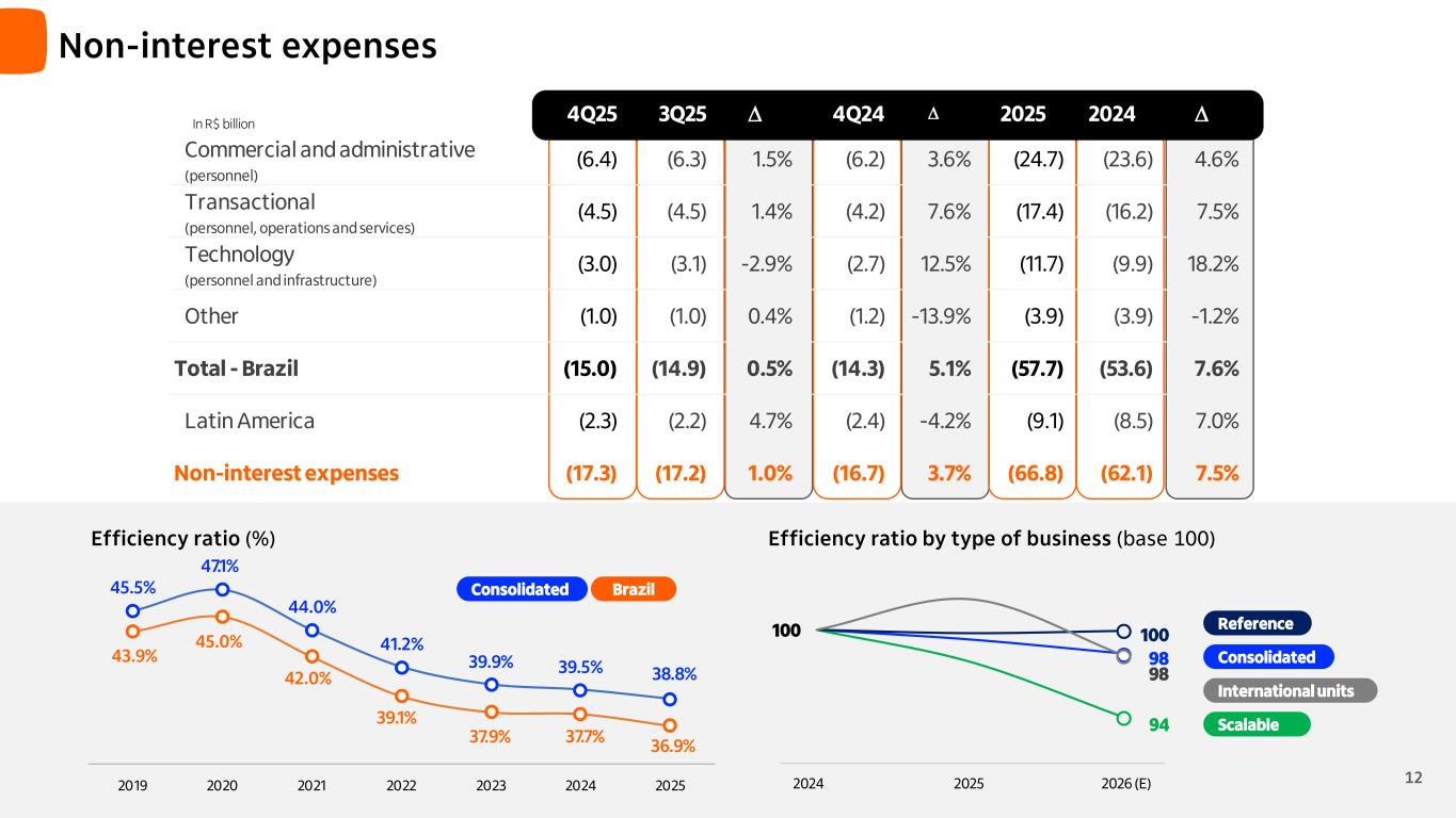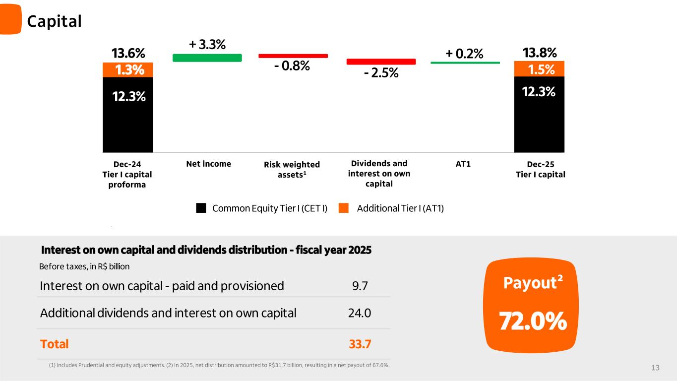 12 ‘‘ BrazilConsolidated Efficiency ratio Non-interest expenses 12 Employees # t o ta l in B ra z il Branches¹ # in thousand (1) Brick and mortar and cliente service branches In R$ billion Latin America BrazilBrazil (ex-Technology) Technology - Brazil 45.5% 47.1% 44.0% 41.2% 39.9% 39.5% 38.8% 43.9% 45.0% 42.0% 39.1% 37.9% 37.7% 36.9% 2019 2020 2021 2022 2023 2024 2025 Consolidated International units Scalable Reference100 100 98 94 98 2024 2025 2026 (E) Consolidated Brazil Efficiency ratio by type of business (base 100)Efficiency ratio (%) ‘‘ 4Q25 3Q25 D 4Q24 D 2025 2024 D Commercial and administrative (personnel) (6.4) (6.3) 1.5% (6.2) 3.6% (24.7) (23.6) 4.6% Transactional (personnel, operations and services) (4.5) (4.5) 1.4% (4.2) 7.6% (17.4) (16.2) 7.5% Technology (personnel and infrastructure) (3.0) (3.1) -2.9% (2.7) 12.5% (11.7) (9.9) 18.2% Other (1.0) (1.0) 0.4% (1.2) -13.9% (3.9) (3.9) -1.2% Total - Brazil (15.0) (14.9) 0.5% (14.3) 5.1% (57.7) (53.6) 7.6% Latin America (2.3) (2.2) 4.7% (2.4) -4.2% (9.1) (8.5) 7.0% Non-interest expenses (17.3) (17.2) 1.0% (16.7) 3.7% (66.8) (62.1) 7.5%