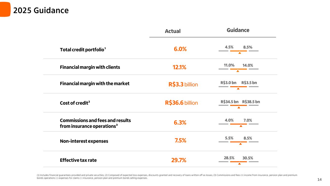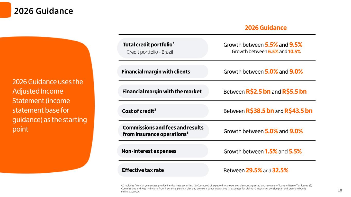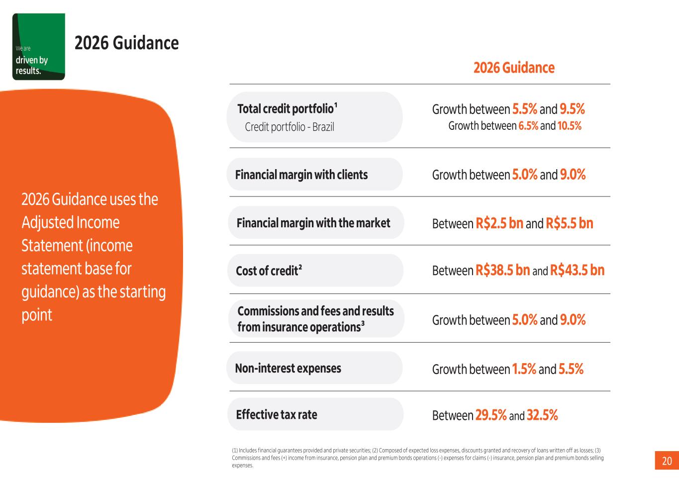 2026 Guidance Total credit portfolio¹ Credit portfolio - Brazil Financial margin with clients Cost of credit² Financial margin with the market Commissions and fees and results from insurance operations³ Non-interest expenses Effective tax rate 2026 Guidance uses the Adjusted Income Statement (income statement base for guidance) as the starting point Growth between 5.5% and 9.5% Growth between 6.5% and 10.5% Between 29.5% and 32.5% Growth between 1.5% and 5.5% Growth between 5.0% and 9.0% Between R$38.5 bn and R$43.5 bn Between R$2.5 bn and R$5.5 bn Growth between 5.0% and 9.0% (1) Includes financial guarantees provided and private securities; (2) Composed of expected loss expenses, discounts granted and recovery of loans written off as losses; (3) Commissions and fees (+) income from insurance, pension plan and premium bonds operations (-) expenses for claims (-) insurance, pension plan and premium bonds selling expenses.