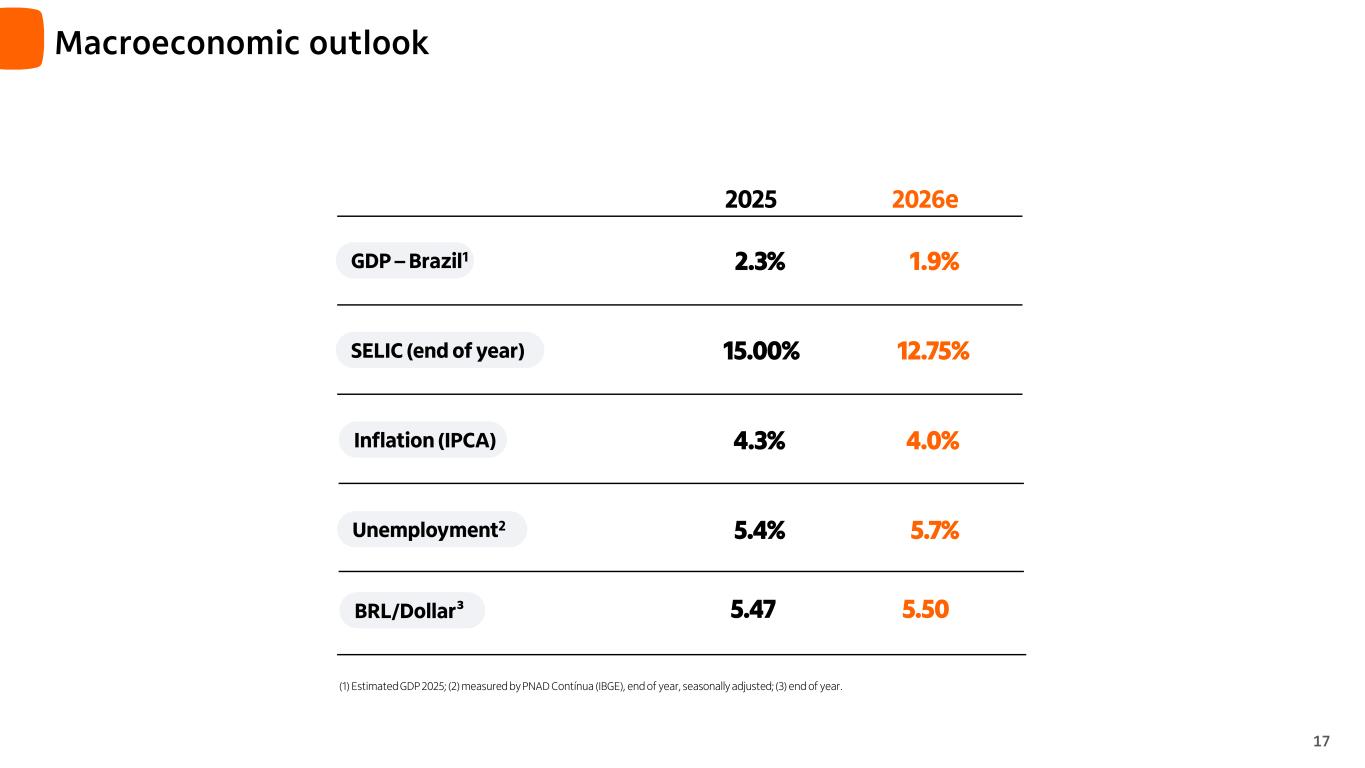 16 ‘‘ Income statement base for 2026 guidance (1) The consolidation of Avenue’s results will occur in 1Q26, as a consequence of the acquisition of control occurred in January-26. (2) Insurance results represents the income from insurance, pension plan and premium bonds operations (-) expenses for claims (-) insurance, pension plan and premium bonds selling expenses. (3) Main reclassifications represent approximately 90% of total reclassifications. Changes in managerial classifications and the consolidation of Avenue’s¹ results. 2 Main reclassifications³: • Expenses related to card network fee: From Non-interest Expenses to Commissions • Net margin from receivables discounting and cost of funding of automatic receivables discounting of the acquiring business: From Financial Margin with Clients to Commissions • Discount on loans in arrears up to 90 days overdue: From Financial Margin with Clients to Cost of Credit In R $ billio n 2025 as reported Reclassifications Avenue 2025 Adjusted Financial Margin with Clients 121.1 2.8 0.1 124.1 Financial margin with the market 3.3 - - 3.3 Cost of credit (36.6) (1.5) - (38.1) Commissions and Insurance Results 58.3 (2.8) 0.3 55.8 Non-interest expenses (66.8) 1.7 (0.5) (65.6) Tax expenses and other (10.8) (0.1) (0.0) (10.9) Income before tax and minority interests 68.6 0.1 (0.0) 68.6 Income before tax and minority interests (20.4) (0.1) 0.0 (20.5) Minority interests in subsidiaries (1.3) - 0.0 (1.3) Recurring managerial result 46.8 - - 46.8 Base for Guidance 2026 spreadsheet – Click here